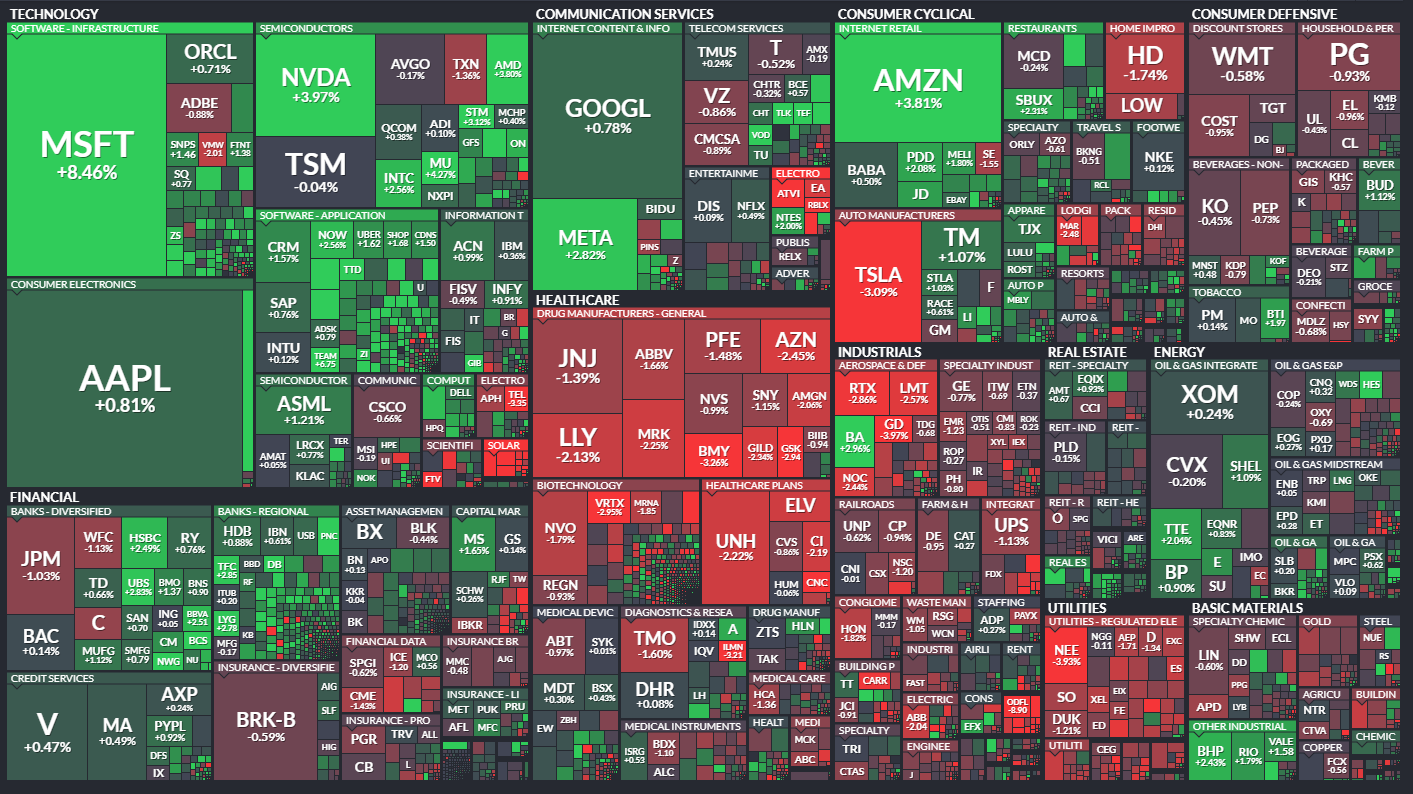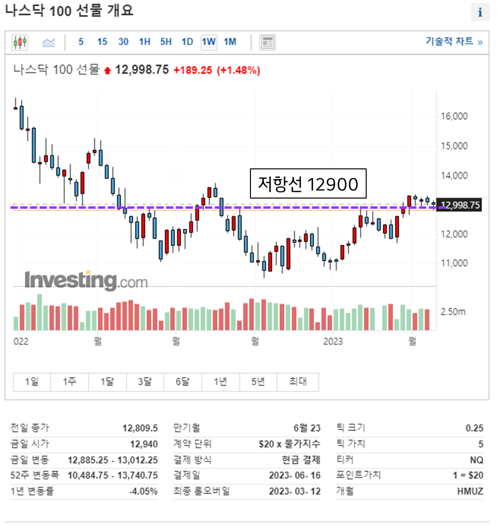 나스닥 100 선물은 12900 포인트를 살짝 깨고 12800포인트에서 반등했습니다. 최근 AI 기술과 접목된 BING 검색엔진 이용자 증가로 실적 호조가 나타난 마이크로 소프트가 가장 눈에띄네요😮