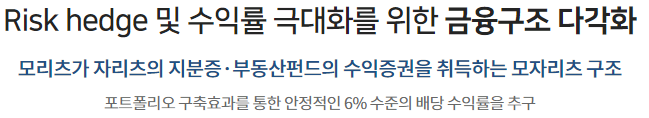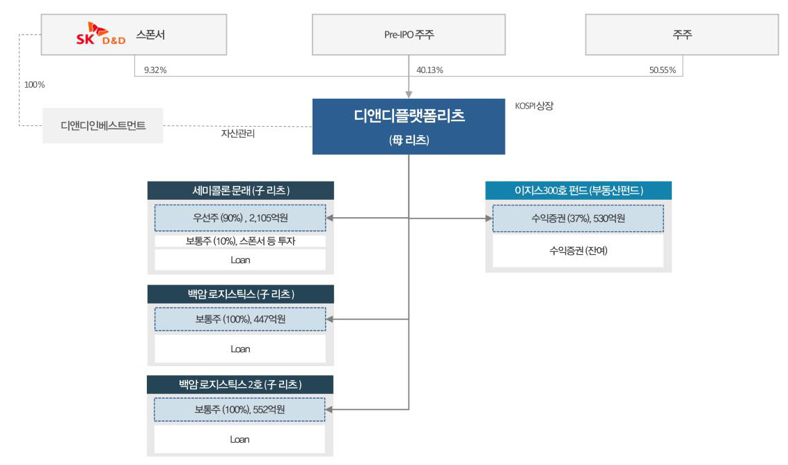 이름에서 알 수 있듯이 리츠회사입니다. 리츠에 관해 간단히 설명 드리자면, REITs(Real Estate Investment Trusts) 란 영어그대로 해석 하면 부동산 투자신탁 회사라는 것을 알 수 있습니다. 이러한 사업구조는 투자자로부터 자금을 모아 부동산, 부동산 펀드에 투자하고 수익을 배당으로 지급하는 투자회사입니다. "디앤디플랫폼리츠" 는 이지스 300호 부동산펀드, 부동산.중개.임대 사업을 하는 회사 세미콜론문래, 백암로지스틱스라는 회사에 대출을 해주고 수익의 일부를 가져가는 것 같습니다. 이지스 300호 펀드부터 보자면 최근 부동산 경기가 안좋아짐에 따라서 해당 펀드에 수익은 제한 적일 수 있습니다. 세미콜론문래, 백암로지스틱스는 부동산 중개.임대업으로 고정 수입을 가져 갈 수는 있겠네요🤔