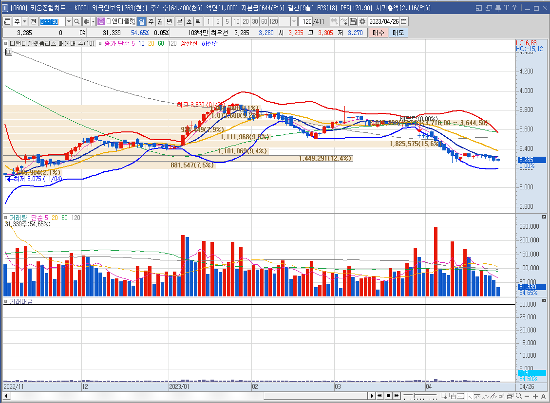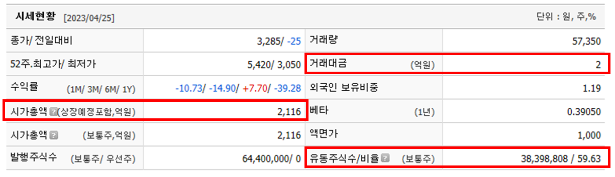 시가총액은 2100억으로 형성되어 있고 유동비율은 59.63%로 양호합니다. 하지만 전일 종가 기준 거래대금은 2억원정도로 거의 거래가 안되고 있다고봅니다. 앞서 말씀드린 부동산 경기 둔화에 따라 시장에서 관심도가 매우 떨어져 있습니다.