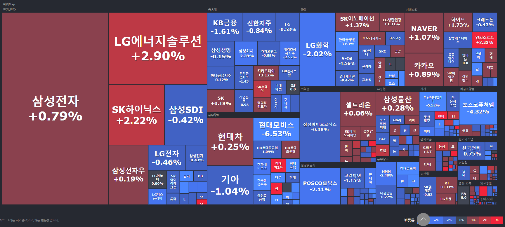 시총 상위 종목을 확인해보면 하이닉스의 실적이 컨센서스 대비 상회하여 반등 했고 LG에너지 솔루션 호 실적 발표로 상승했고 서비스 업종인 카카오 네이버가 소폭 상승했네요! 최근에 2차전지 소재주인 LG화학, 포스코 퓨처엠이 하락했고 하락장에서도 상승했던 기아가 소폭 조정을 받는 모습입니다. 현대 모비스는 공매도 세력에 의해 큰폭으로 하락했네요😥정말 힘든장입니다. 개인적으로는 최근래 하락장에서 가장 잘버틴 최근 제약 바이오주가 계속 눈에들어 오네요🤔