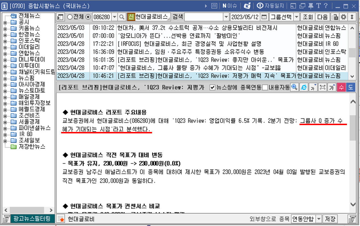 현대글로비스의 종합시황 뉴스를 확인해보면 별다른 내용은 없고 앞에서 언급한 그룹사 Q (판매량) 증가에 따른 수혜가 기대 된다는 증권사리포트의 의견들이 대다수를 차지하고 있습니다. 😋
