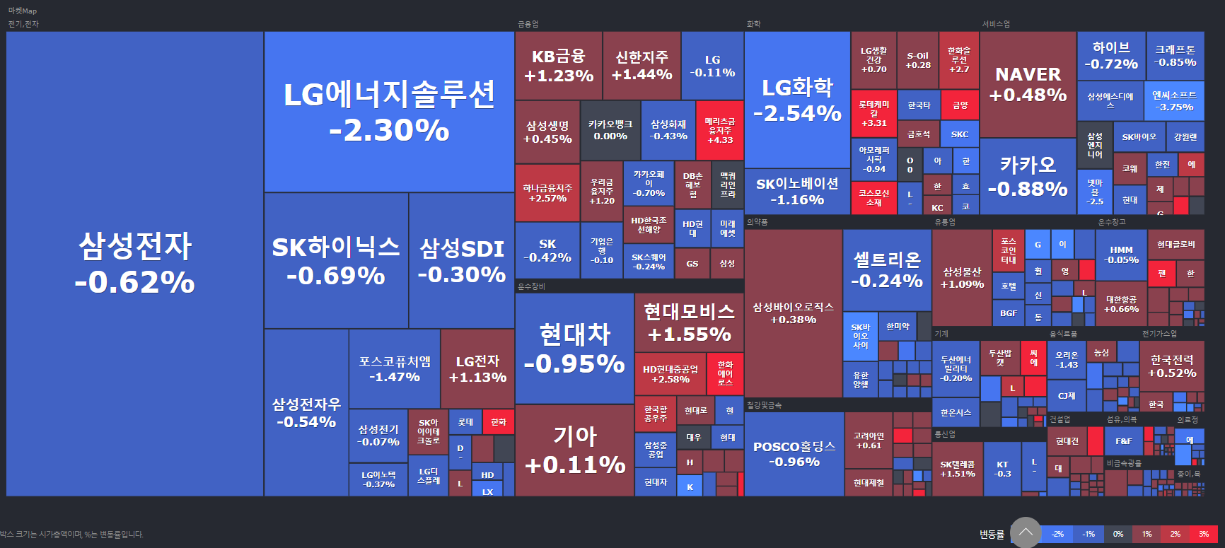 한경에서 제공하는 코스피 마켓맵입니다. 시총 상위 종목에서는 LG에너지솔루션, LG화학이 에코프로 그룹의 영향 때문인지 2% 정도 하락을 했고, 반도체 관련주 및 현대차는 소폭 하락으로 마감했습니다. 이와 반대로 금융 주 전반적인 상승으로 인해 장전반적으로 크게 하락을 할 수 있었으나 코스피 약보합권을 지켜준 것 같네요.😥 아직은 주도 섹터가 나오지 않고 힘없는 장세가 지속되고 있습니다.