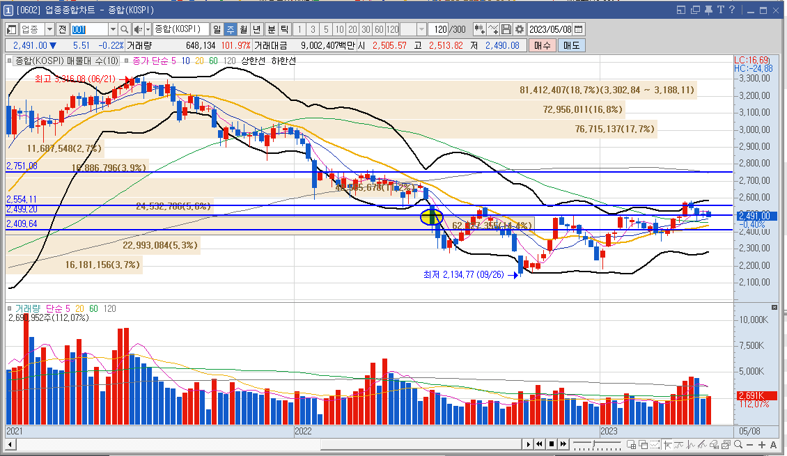 코스닥의 업종 종합 주봉 차트입니다. 금일 2500포인트를 깨고 내려와 2491포인트로 약 보합 수준으로 마감했습니다. 아직까지는 2500포인트 부근을 완전히 깼다고는 볼 수 없으니 내일 금요일장 마감까지 확인해봐야겠네요. 아래 꼬리를 달고 2500포인트에는 안착했으면 하는 바람입니다.