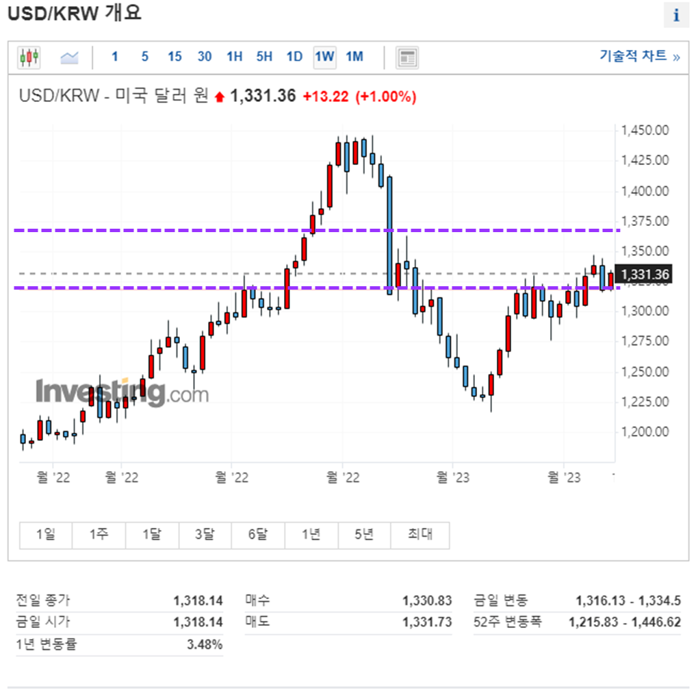 원달러환율은 지지선을 밟고 현재 기준으로 13.22원이 오른 1330원을 빠르게 돌파하고있습니다. 기술적 분석 상 하락 추세에서의 바로 반등은 정말 힘있는 상승 추세인데 더 가파르게 오를까 걱정입니다.😭