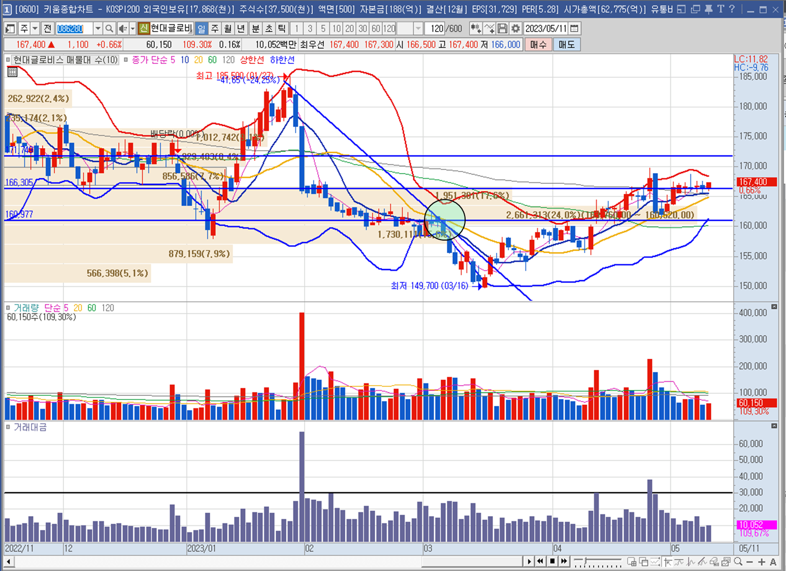 현대글로비스의 일봉차트입니다. 가장 큰 매물대라고 생각이 드는 추세선 (대각선) 돌파하려다 실패한 자리 (파란색 원)에 매물대를 돌파하면서 안착하고 점진적으로 상승해서 다음 지지선까지 안착하는 흐름을 보여주고있습니다. 기술적 분석으로는 좋은 자리에 있네요! 시장의 상황만 괜찮다면 기술적 분석으로만 봤을 때는 당장이라도 사고싶은 자리입니다.