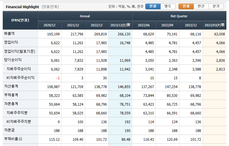 현대글로비스는 2020년 이후로 꾸준히 성장하여 매년 전년 대비 약 50% 상승한 영업이익을 창출했네요. 아마도 현대차, 기아차의 판매대수 증가에 따라서 당연히 자동차나 자동차부품의 운송량이 많을테니 동반 상승한 것으로 보입니다. 현대차, 기아차가 세계에서 점유율을 높여 벌써 글로벌 완성차 업체 판매 대 수 기준으로 3위로 올라왔기 때문에 자동차 물류사업인 현대글로비스 또한 여러모로 기대가 되는 종목이네요.😊