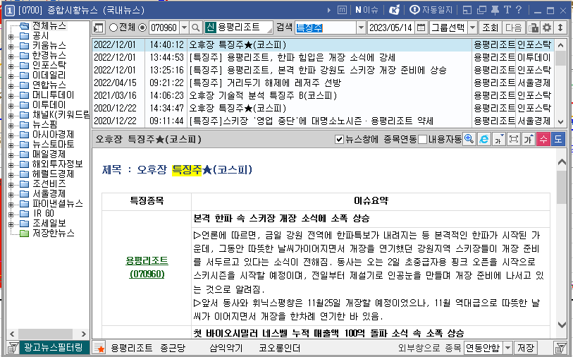 종합시황뉴스는 2022년 12월에 나온 거리두기 해제에 따른 스키장 개장 소식에 소폭상승한 뉴스 뿐 별다른 특징이 없습니다. 날씨가 따듯해진 지금 골프장 영업이 한창 때여야 할 시기인데 그런 소식은 없네요.🤔