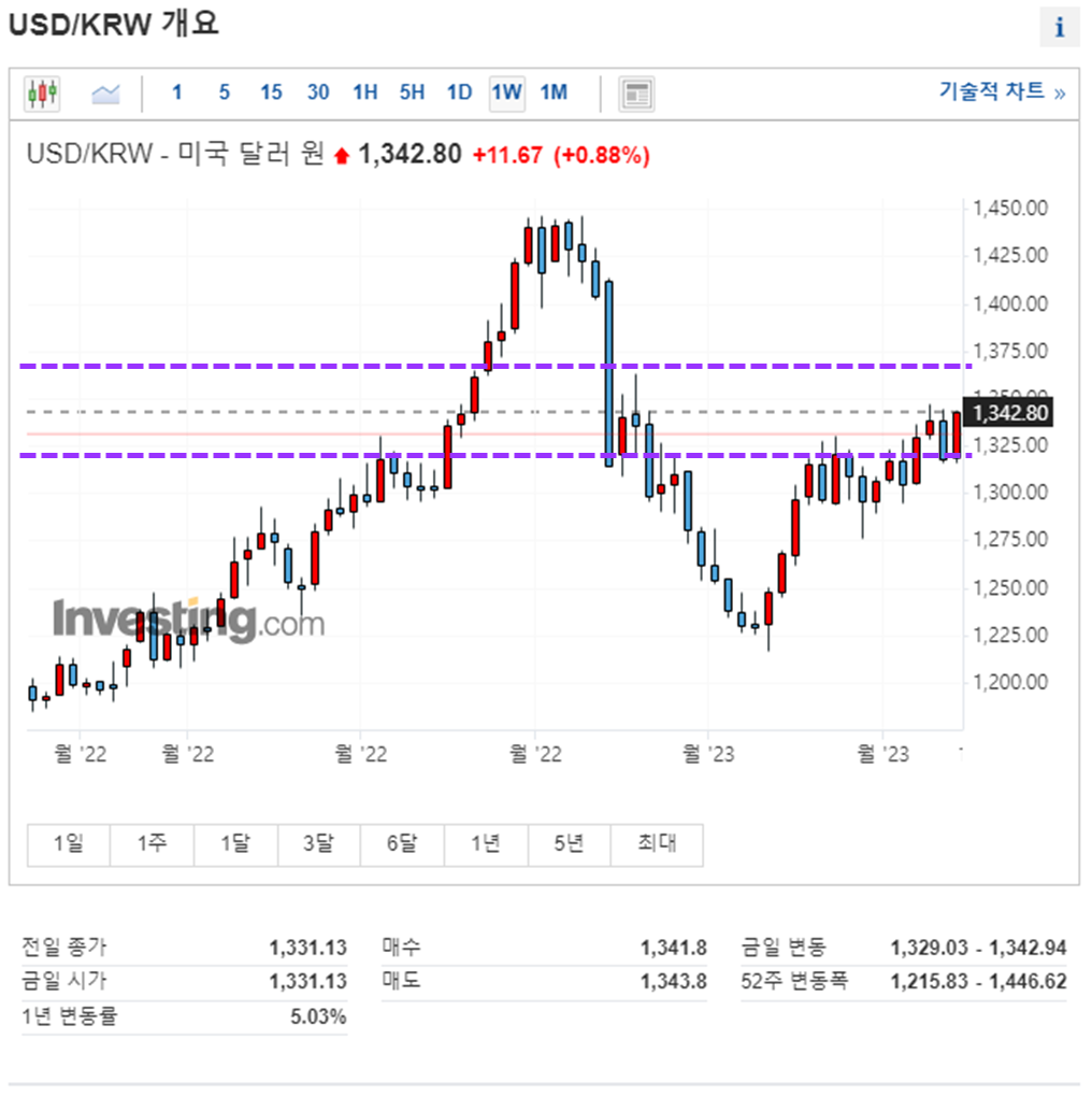 나스닥100 선물지수는 직전 고점에 근접하여 횡보중에 있습니다. 계속해서 지지선을 터치하고 있는 흐름을 보이는데 돌다리도 너무 많이 두들기면 무너지기 쉽상이니 보수적으로 접근해야겠습니다. 원달러환율은 지지선을 터치하고 바로 급등하여 지난주 하락 폭을 다 회복하여 1342.80원으로 마감했네요. 하락 이후 바로 반등은 강한 상승 추세로 다음 매물대까지 직행 할 수 있는 무서운 추세입니다. 월요일 장 시작 시 외국인 이탈로 인한 코스피 추가 하락이 있을 듯 보여 무섭네요.😥