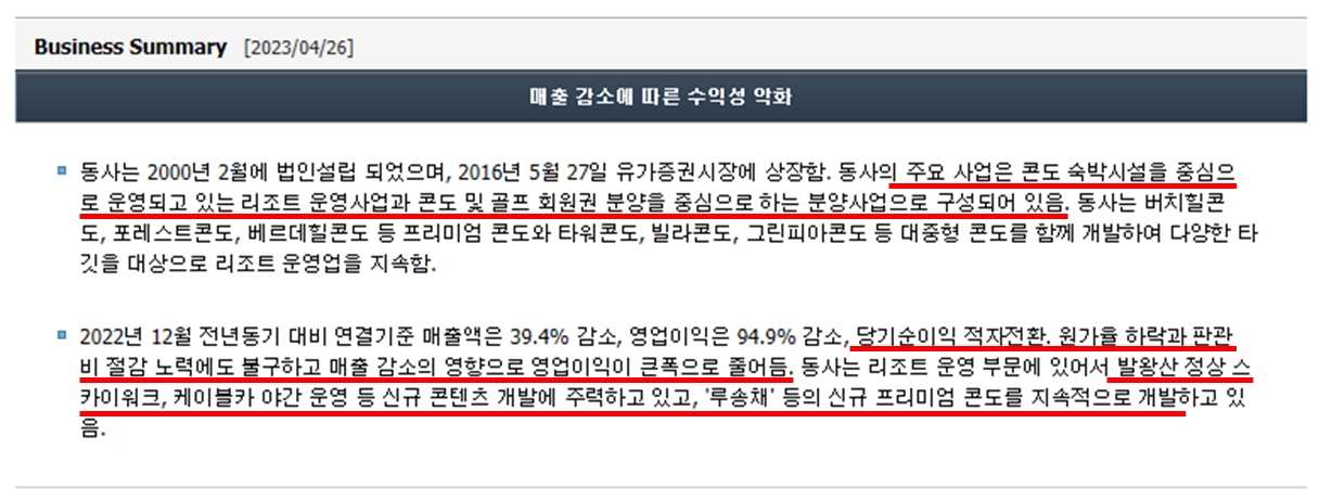 용평리조트의 연결재무제표입니다. 2021년도 유동성증가로 한창 골프가 유행했던 시절에만 당기순이익이 + 였고 2020년과 2022년은 100억이상의 당기순손실이 발생했네요. 아직 자본은 위험한 수준은 아니나 부채증가에 따른 이자가 만만치 않을 것으로 보이네요. 2023년 1분기 영업이익을 봐야겠으나 아무래도 골프장이나 리조트는 아무래도 잉여 소득으로 이용되는 사치재 성격을 띄고 있으니 경기 둔화가 지속되고 있는 지금 상황에서는 영업손실이 지속 될 가능성이 더 높겠습니다.😪