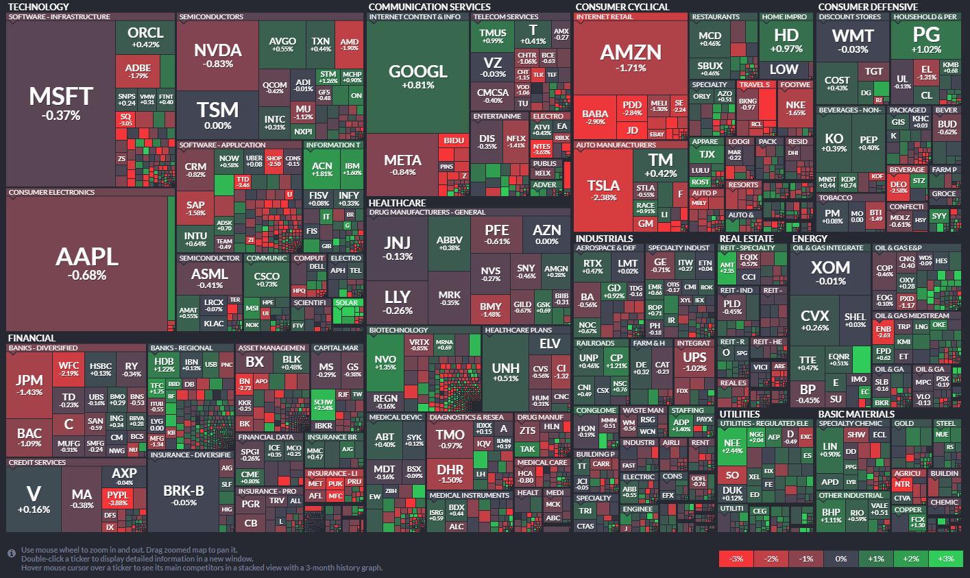 미국 시장 마켓맵의 시가총액 상위 종목을 보면 마이크로소프트, 애플, 아마존, 알리바바, 테슬라 할 것 없이 모두 하락했습니다. 구글은 인공지능 챗봇 바드 영향으로 소폭이긴 하지만 상승이 지속되고 있는 것으로 보입니다. 무엇을 기다리는지 모르겠으나 관망세가 지속 되고 있는 것 같네요. CPI를 호재로 볼 것 인가 악재로 볼 것인가 갑론을박 중인 것 같습니다.🤔