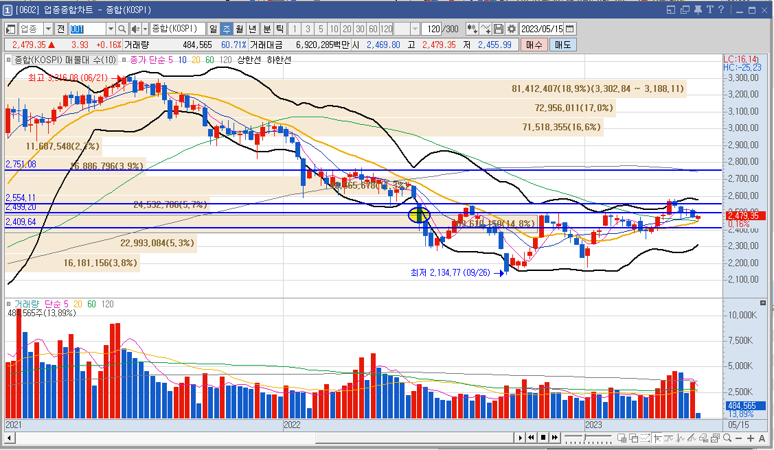 코스피 업종 종합 차트입니다. 지난 주 10선 부근을 겨우 지켜 약간의 안심을 하고 있었으나 장 초반 바로 하락하여 20,60선을 터치하고 반등하여 지지선이였던 10선 부근에 저항을 받고 있는 모습입니다. 아직 SG발 폭락사태 여파로 일부 증권사에서 레버리지 투자를 막아 유동성이 줄어 수급이 좋지 않은 이슈가 있고 미국 부채 한도 협상, 원달러 환율 상승 이슈로 한국 시장 전반적으로 좋지 않은 상황입니다.😪