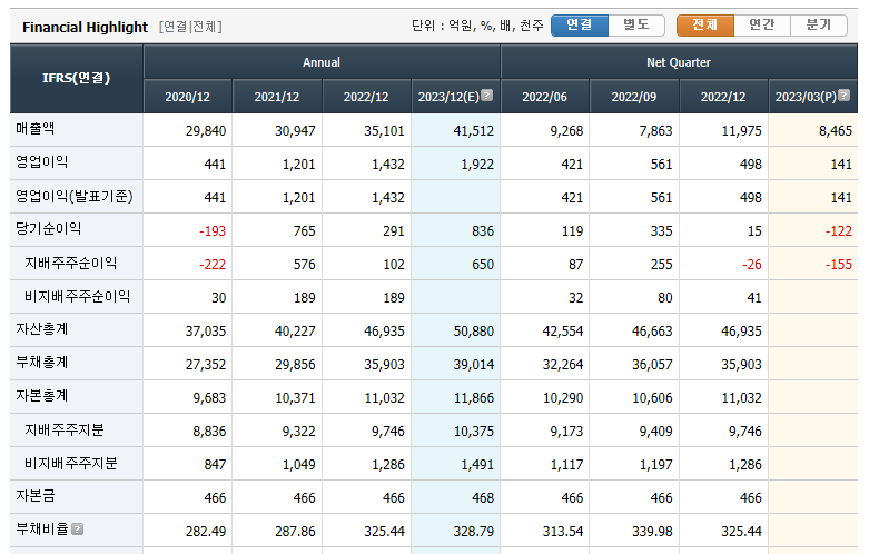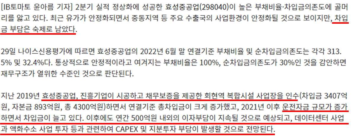 효성중공업의 연결재무제표를 확인해보면 매출액과 영업이익은 꾸준히 성장하고 있는데 당기순이익은 도통 늘지 않는 모습이네요. 부채비율이 매우 거슬리는데 22년 12월 기준 자본1.1조의 325% 해당하는 3.6조의 부채를 갖고있네요. 고 금리시대에 부채가 지속해 늘어나는것은 좋지 않은 시그널이네요. 뉴스를 좀 찾아보니 무리하게 투자를 한게 아직 회수 되지않아 발생한 부채인 것으로 보입니다.😕