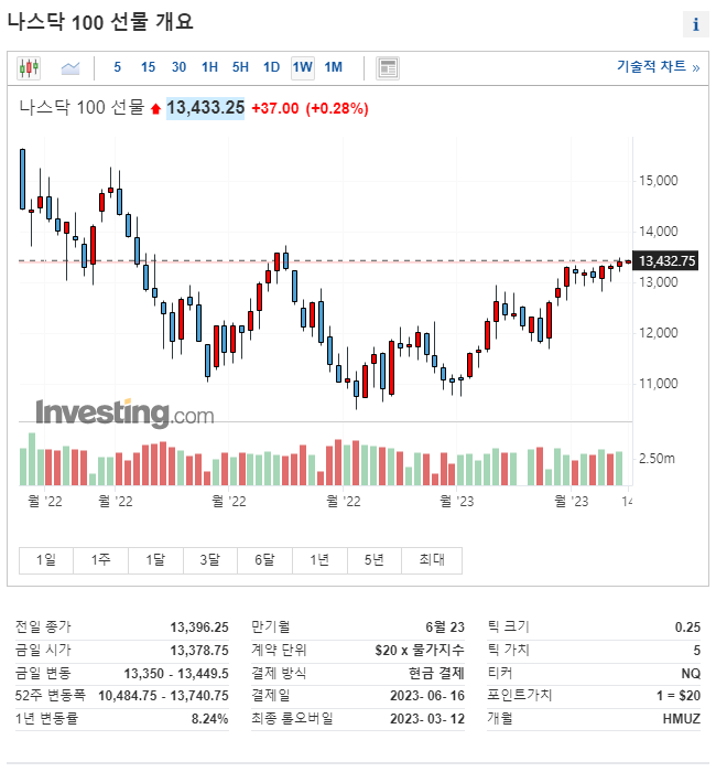 미국 나스닥 100 선물 지수는 코스피시장과 유사하게 강 보합권을 유지하며 특정한 방향성 없이 소강 상태에 있는것으로 확인됩니다.시총 상위 기업 중 일부 섹터에 호재가 나와 시장을 주도하는 장세가 나왔으면 좋겠네요. 원달러환율은 1340원을 돌파하여 큰일이다 싶었는데 위안화 강세의 여파로 달러 가치가 하락하여 현재 5/16 (화) 02:00 AM 기준으로는 1336원으로 하락했습니다.