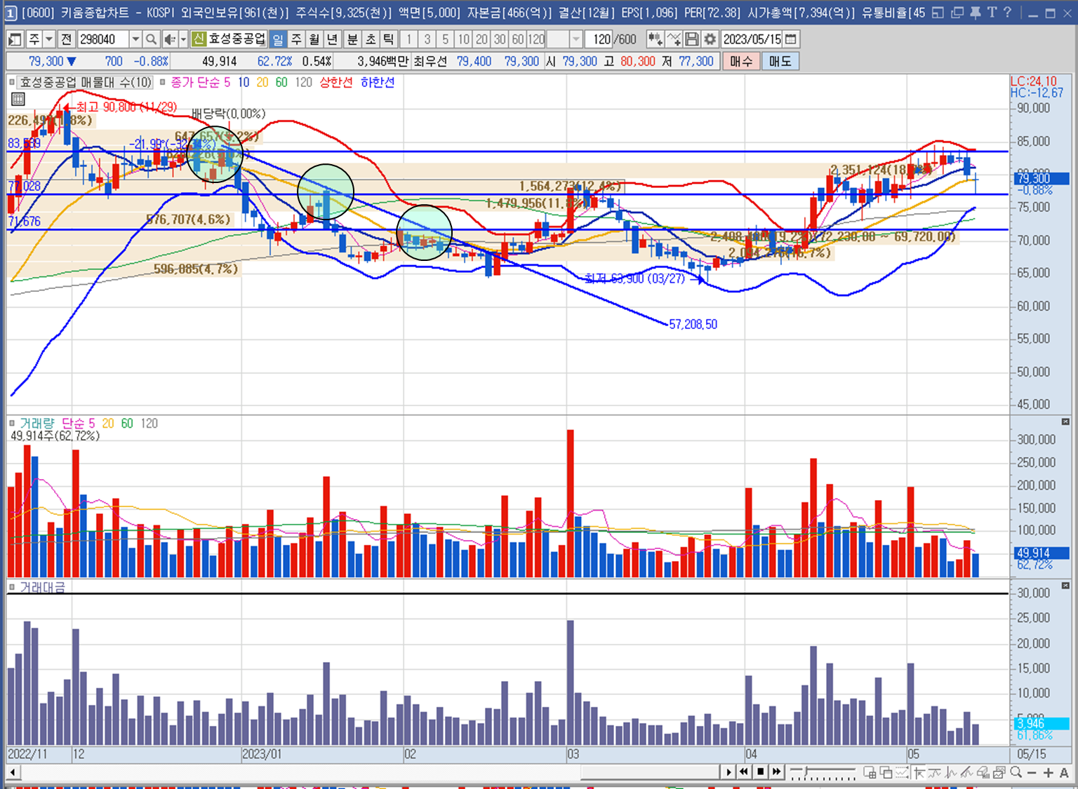 효성중공업의 일 봉 차트입니다. 하락 하면서 만든 매물대 (하늘색 원) 부근에서 시세가 나오거나 막히거나 지지받는 모습이네요. 한 가지 기술적 분석의 팁은 하락추세에서 추세 돌파하려고 했던 부분이 매물대인 경우가 많으니 체크하면서 넘어가도록 해요.😄 효성중공업의 일봉차트 상 77000원 부근에서 지지 부진 할 것으로 보여 이동 평균선의 수렴 지점에서의 상황을 확인해봐야겠습니다.