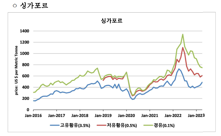 LPG가 해외에서 친환경 대체 연료로 인정받아 현재 세계 트랜드와 부합하여 소폭이지만 지속적인 성장을 할것으로 보이네요.😮 선박을 운용하는 비용 만 절감되면 극적인 매출 성장도 할 수 있겠습니다.선박에는 경유와 중유를 적당히 섞어 사용한다고 하니 유가의 흐름을 토대로 운용 비용이 어떻게 될지 확인해보겠습니다. 아래는 선박 연료 공급지인 싱가포르 유 가격 추이입니다. '유황유'라고 표기 되어 있는것이 중유라고 보시면 됩니다. 2022년 러시아 우크라이나 발 유가상승으로 연료가격이 피크를 찍었으나 이후 하락하여 전쟁 전 가격부근까지 근접했네요. LPG 수요는 증가하고 연료비는 하락하는 추세이니 매출액 대비 영업이익률이 상승하는 효과를 기대해 볼 수 있겠네요.😊