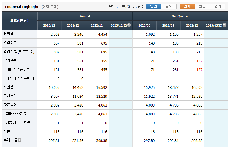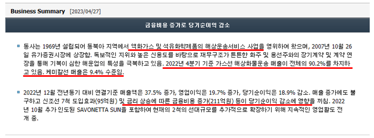 KSS해운의 연결재무제표입니다. 2020년부터 2022년까지 매출이 지속적으로 크게 상승하는데 반해 영업이익은 드라마틱한 상승을 보여주고 있지는 않네요. 원인은 위에서 언급한 바와 같이 러시아 우크라이나 전쟁으로 인한 에너지 가격상승으로 운용 비용이 증가한 것과 더불어 최근 지속적인 금리 인상으로 인해 금융이자를 매우 많이 지불하고 있는것으로 보입니다. 자본대비 부채가 어마어마하네요😥 공식 홈페이지 확인 시 부채 비율에 관해 주주들이 반발이 있어 회사측에서 대응 방안에 관해 여러가지로 검토중에 있는것으로 보입니다. 민감한 질문에 관해 피하기보다는 이러한 적극적인 대응은 주주들로 하여금 신뢰를 줄 수 있어 좋은 방향으로 해석됩니다.