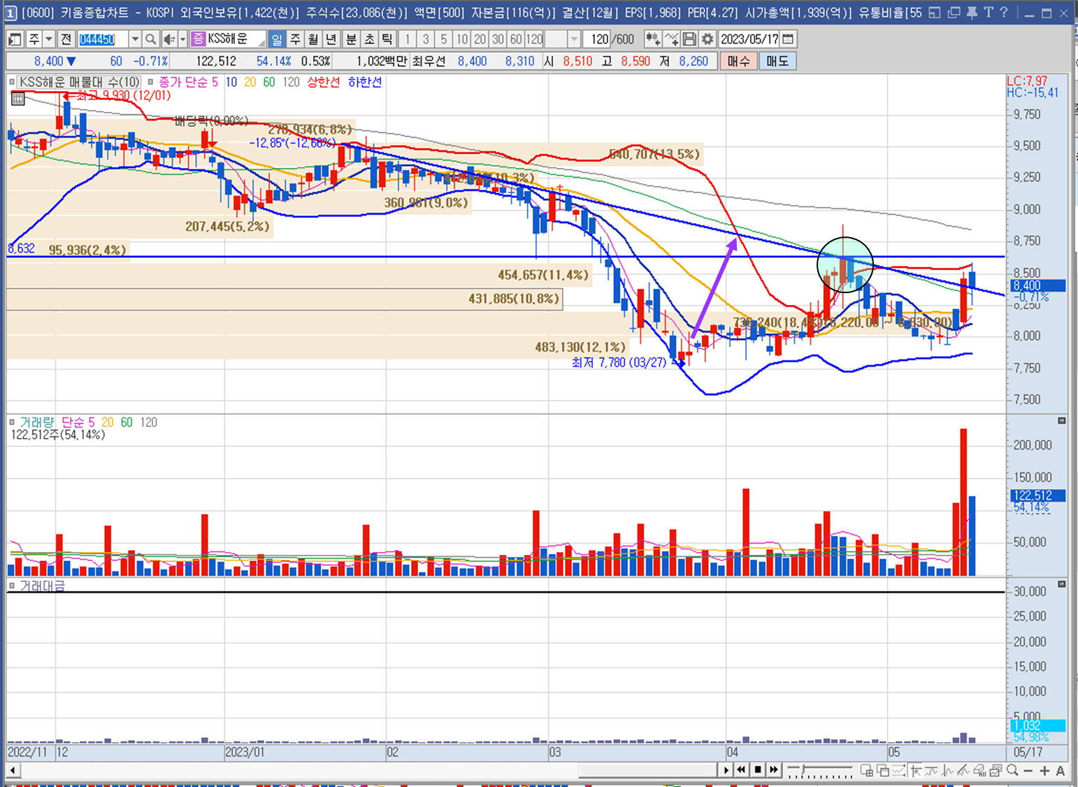 KSS해운의 거래일 기준 120일 간의 일봉차트입니다. 거의 죽은 종목 마냥 최근 거래대금이 거의 없고 매집(?)이라고 보일만한 거래도 보이지 않습니다. 거래대금상 별다른 특징이 없으니 봉 기준으로 기술적 분석에 관한 공부를 해보겠습니다. 추세선 (대각선) 을 그어보면 추세를 넘다가 실패한 지점(파란색 원)이 보통 매물대가 됩니다. 추세선 이탈한 가격대에서는 과대 낙폭으로 보고 대각선 근처까지 회귀(보라색 화살표)하려는 성질을 가지고 있습니다. 이러한 지식을 다른 종목 분석 할 때 활용하면 좋을 것 같네요.🤗