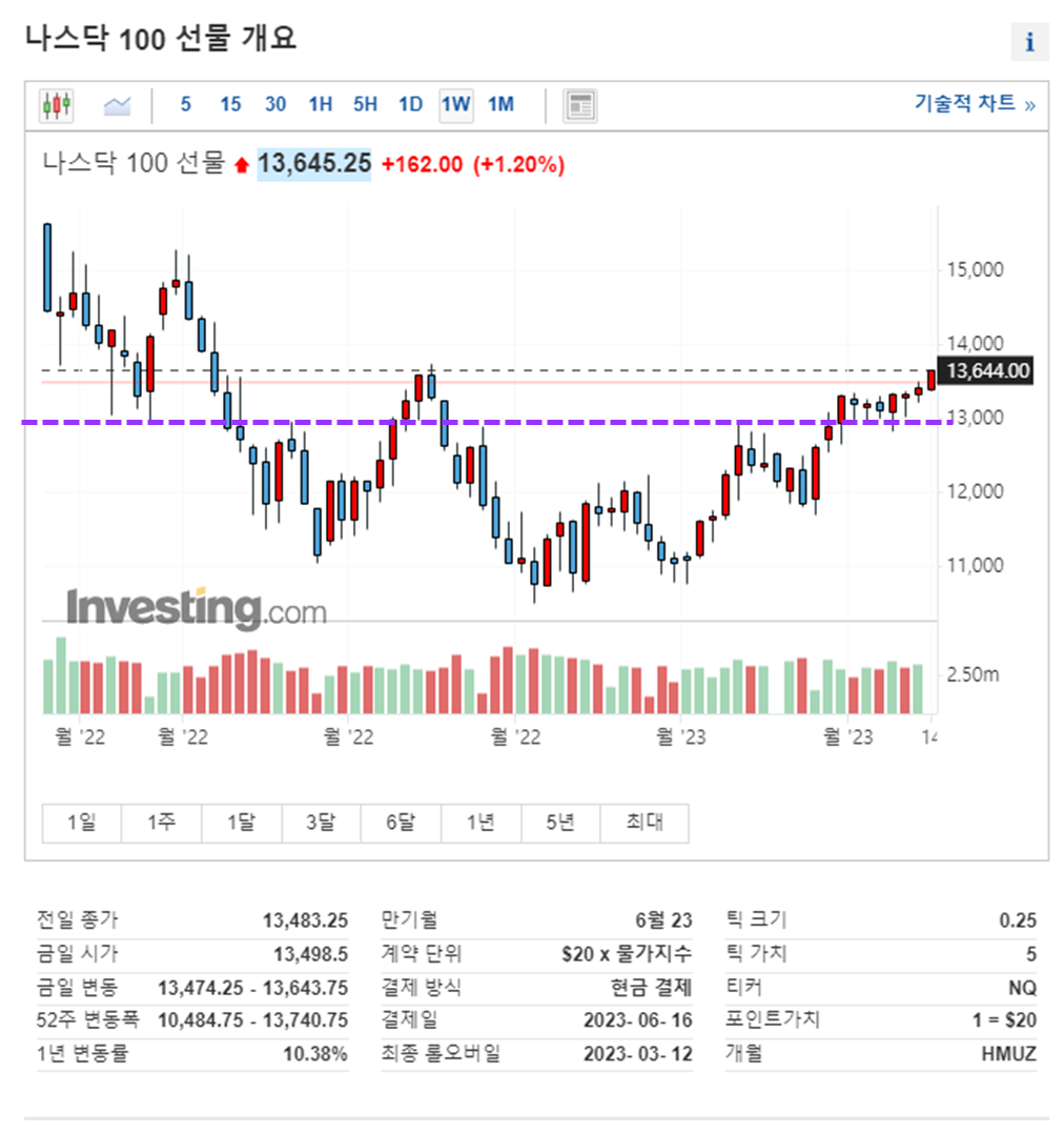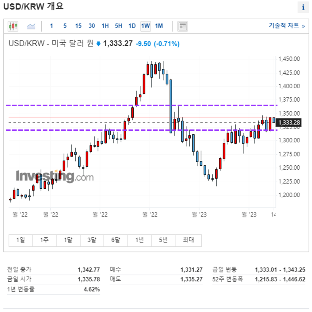 나스닥100 선물 지수는 장기간의 박스권 횡보를 깨고 전 고점을 향해 가고 있습니다. 전 고점 터치후 흐름을 지속 모니터링하여 시장 대응을 해야 될 것 같습니다. 원달러환율은 1340원대에서 1333원까지 내려온 모습입니다. 두번째 미국 부채 한도 협상 결렬이 되어 아직은 안심하기 어렵습니다. 부채 한도 협상이 결렬되면 위험 자산 회피 성향으로 달러가치가 상승하여 원달러 환율이 올라간다고 하지만 미국 정부의 부채 위기 해결 장기 계획을 발표함에 따라 시장도 상승하고 원달러가치도 하락 한것으로 보입니다.