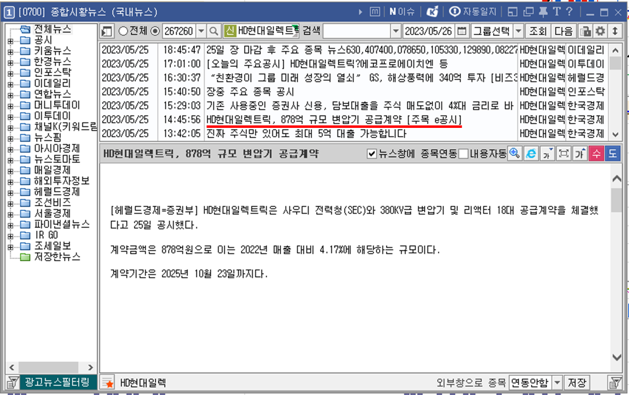 HD현대일렉트릭의 종합시황 뉴스입니다. 전체적으로 둘러봤을 때 전력기기 수요증가로 인한 국내 3사 LS ELECTRIC, HD현대일렉트릭, 효성중공업이 실적 호조를 나타낸다는 뉴스들이 동일하게 있습니다. 오늘 나온 특징 뉴스로는 사우디 전력청과 878억의 공급 계약을 체결했다는 뉴스가 나왔네요. 작년기준 매출액 대비 영업이익은 단순 계산 시 6.3% 정도로 이번 계약 건을 영업이익으로 환산하면 55.5억 정도 영업이익 수준이네요. 실질적으로는 큰 규모의 공급계약은 아니기 때문에 오늘 주가가 변화를 보이지 않은 것 같습니다.🤔