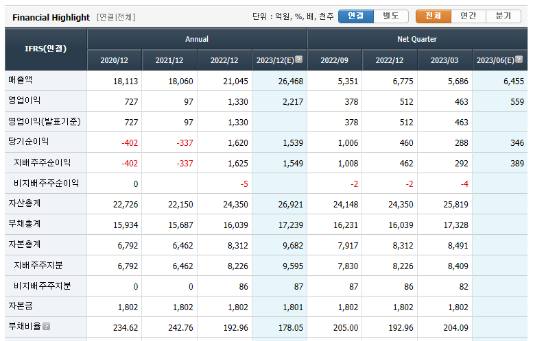HD현대일렉트릭의 연결제무제표입니다. 당기순이익 기준 2020년부터 적자를 지속하고 있다가 작년에 비약적인 성장을 하여 당기순이익이 흑자로 전환했습니다. 영업이익기준으로 봐도 10배가 넘는 영업이익을 창출했네요😮 어떤 이슈가 있었는지는 모르겠으나 비정상적으로 증가하여 확인은 필요해보입니다. 2023년 추정치로는 2022년과 동일한 당기 순이익을 보이고 있네요. 작년 2022년대비 2023년에는 이익이 유지가 되는 수준이기 때문에 2022년의 실적이 현재 주가에 많이 반영되어 현재 수준이 고점일 확률이 높습니다.