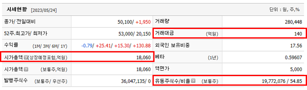 HD현대일렉트릭의 시가총액은 1.8조, 최근 영업일 기준 거래대금은 140억, 유동비율은 54.85%로 LS ELECTRIC과 거의 유사한 시세 현황입니다. 한가지 다른점은 거래 대금이 상대적으로 높아 시장에서 관심도는 더 높은것으로 보입니다.