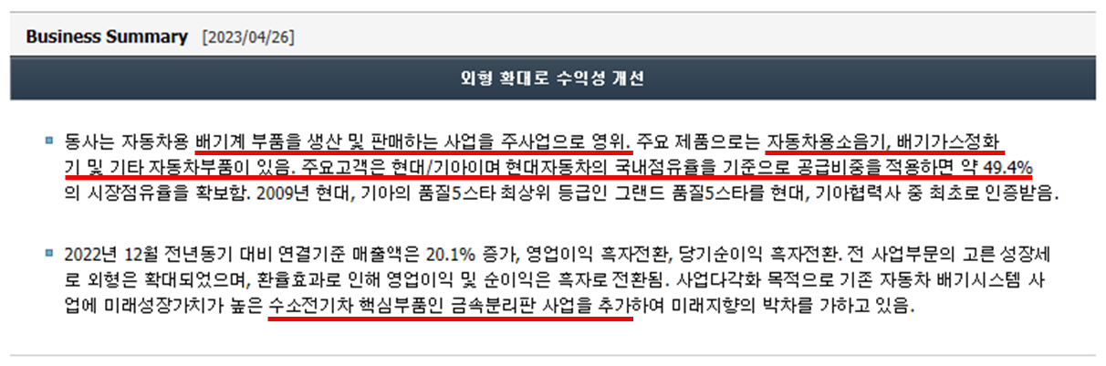 "세종공업"의 제무재표입니다. 2020년부터 2022년으로 갈 수록 매출 성장세를 보였고 2022년에는 처음으로 영업이익 흑자전환에 성공한 모습이네요. 당기순이익은 영업 외 비용이 증가하여 2억으로 확인됩니다. 이는 이자부담으로 인한 부채 상환으로 추측됩니다. 영업 외 수익/비용이 어디서 발생했는지 나타나는 자료들이 있었으면 좋겠네요.😟 2023년 1분기 영업이익 만 전년 토탈 영업이익에 반 이상을 벌었습니다. 이는 글로벌 신차 수요가 견조하게 상승하고 있어 부품주에 동반 상승 영향으로 보입니다. 아직 수소에서의 성장 모멘텀은 나오지 않은 것 같네요. 수소 관련 이벤트나 소식들을 종합 시황뉴스들에서 찾아 보도록 하겠습니다.