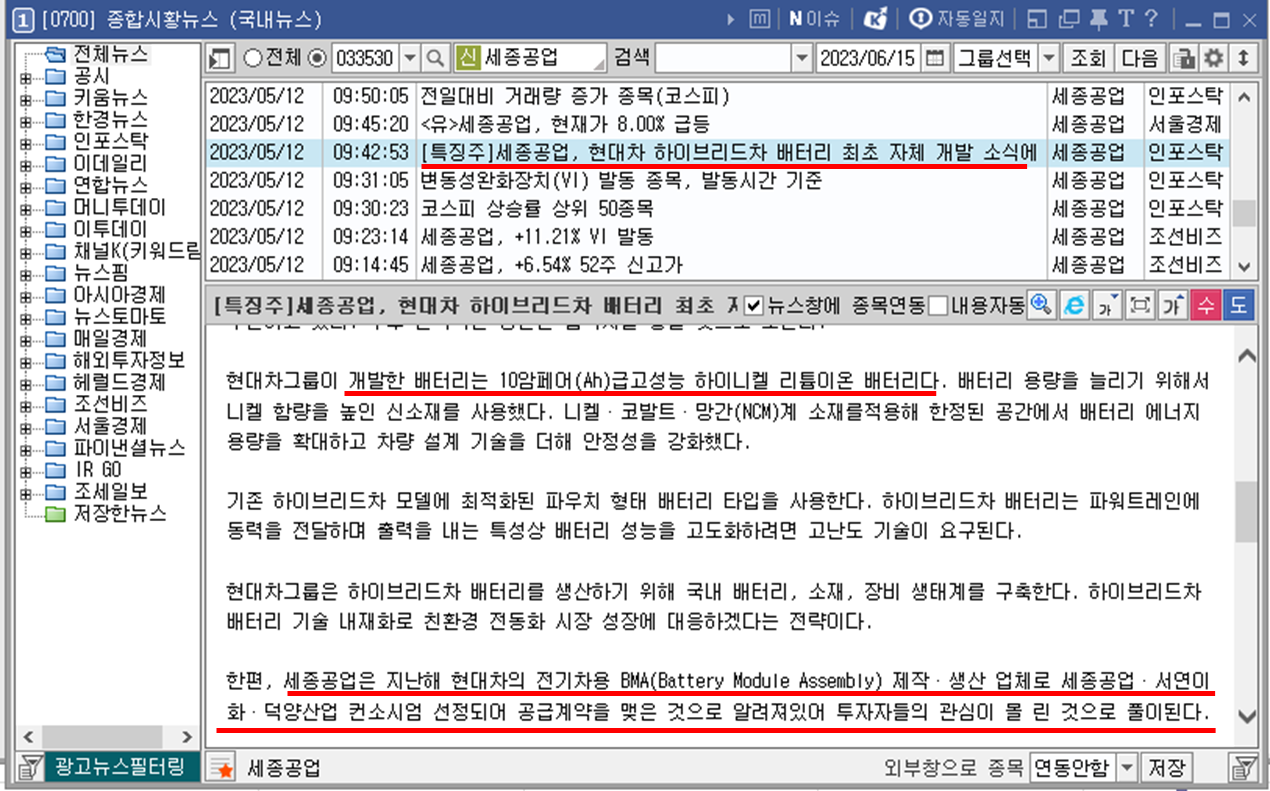 "세종공업"의 종합 시황 뉴스입니다. 주봉 상 강한 힘이 들어온 지점인 5/12 뉴스입니다. 현대차가 자체 하이브리드 배터리를 개발에 성공했다는 뉴스이며 세종공업이 관련 부품 공급계약을 맺었다는 내용의 호재성 뉴스입니다.