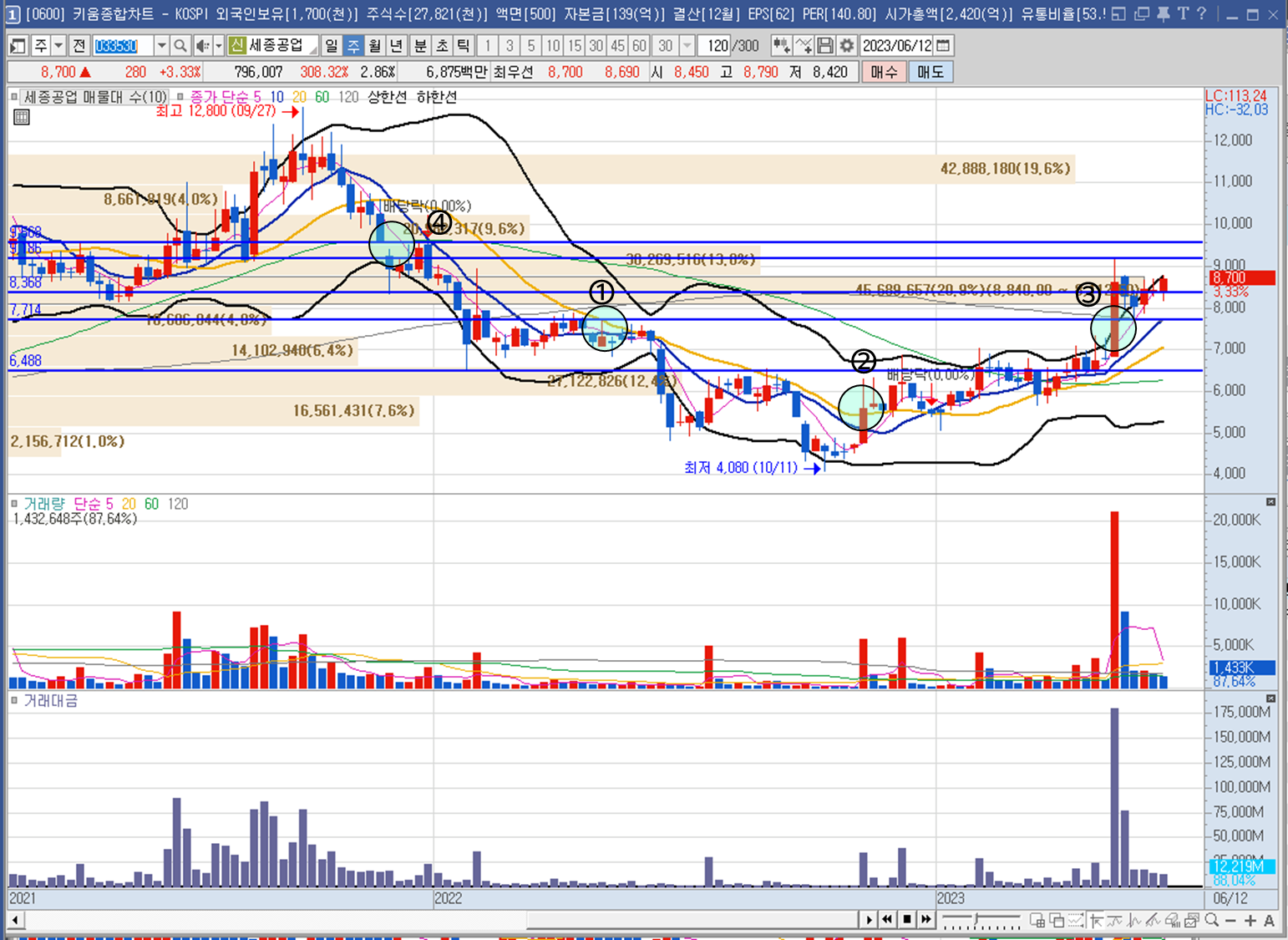 "세종공업" 의 120일간의 일봉상은 최근이 고점이여서 주봉차트를 가져와봤습니다. 하락 추세에 있던 종목이 20선 추세 전환을 시도 했으나 실패했으며 (1번 자리) 추가 하락 중 20선을 돌파하는 추세전환 봉이 발생했습니다. (2번 자리) 이후 저점을 높이며 횡보 하던 중 뉴스가 나오며 1번 자리 매물대 + 120선 돌파하는 강한 장대 양봉이 출현했습니다. 이후 그 다음 매물대인 갭하락 부분 (4번 자리) 에서 맞고 소폭 하락 한 모습입니다. 여기서 중요한 것은 하락추세에서의 매물대 + 120 선을 돌파했다는 부분인데 이는 강한 힘이 들어 왔다는것을 입증하는 것이고 쉽게 하락 국면으로 접어들지 않는다는 뜻이기도합니다.😅 8400원부근 횡보하는 모습을 한번 확인하고 지켜보겠습니다.