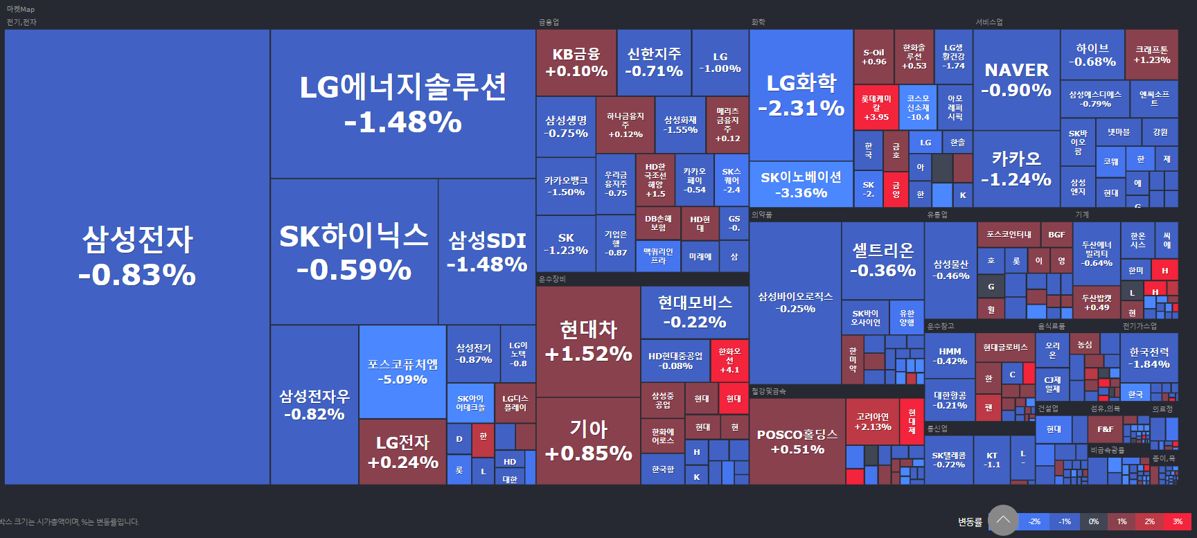 마켓맵 특징은 최근 상승이후 조정 받았던 현대차 그룹주, 철강, 석유화학, 현대로템 상승 외 대부분의 종목이 파란 물결입니다. 현대로템 상승 원인은 수소 전기 트램 사업과 관련되어 호재성 뉴스로 상승한것으로 보이는데, 점점 수소 산업 육성에 윤곽이 들어나고 있는 것 같습니다.😊