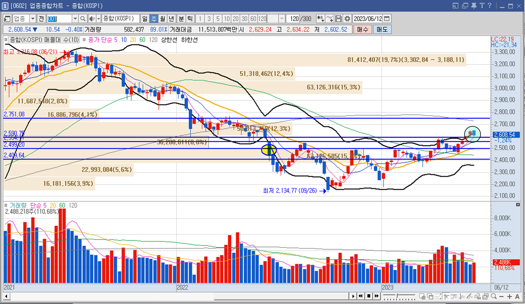 코스피 업종 종합차트입니다. 중국 경기 둔화 우려로 인해 상승하던 코스피 종합 지수는 10.54 포인트 하락한 2608.54 포인트로 마감했습니다. 어제 예상한대로볼린저 밴드상단을 깨고 내려갔기 때문에 다음 지지선인 2600포인트 근처로 왔습니다. 그래도 다음 지지인 2600 포인트 근처로 왔기 때문에 명일 주가 지수는 잠깐이라도 기술적으로 반등 할 가능성이 있겠습니다. 큰 상승을 바라지는 않으니 지지선을 잘 다져 견고히 하는 주가 흐름이 나오길 바라고 있습니다.😔
