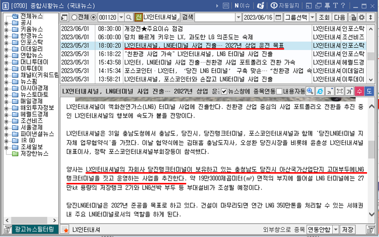 종합 시황 뉴스입니다. LX인터내셔널이 포스코인터내셔널과 함께 LNG 터미널 사업에 진출 했다는 소식입니다. 기존 화석 연료 사업에서 친환경 사업으로의 전환을 꾀하는 신호탄인듯 보입니다. LNG 터미널은 액화상태의 LNG를 기반으로 기체화시켜 다양한 수요처에 공급 할 수 있는거라고 보시면 될 것 같습니다. 아직 니켈 광산을 성공적으로 개발했다는 뉴스는 없고 니켈 광산 인수는 진행했다는 소식이 있으니 아직 이슈화 되지 않은 한방이 기다리고 있을것 같은 느낌입니다. 😊