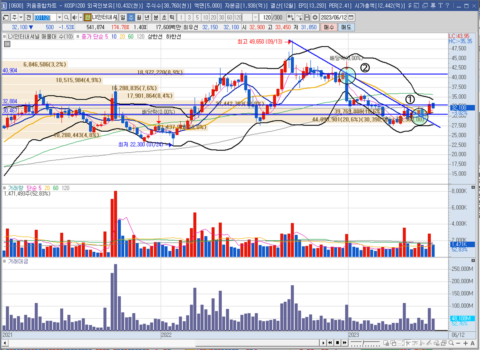 LX인터내셔널의 시세현황입니다. 시총 1.26조, 거래대금 102억, 유동 비율 68.08%로 시총이 크거나 작지도 않고 시장에 관심도도 어느정도 있으며 유동 비율도 적절한 종목입니다. 정규분포로 치면 중앙에 있는 평범한 위치에 있는 상황입니다. 이런 종목이 아이러니하게도(?) 트레이딩 관점에서는 가장 베스트입니다.😄