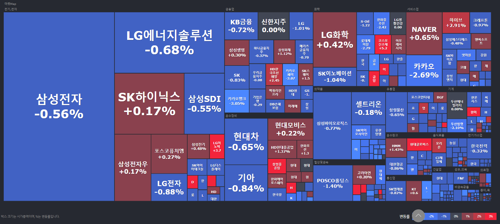 한경에서 제공하는 코스피 마켓맵입니다. 금일은 전반적으로 시총상위 종목이 하락 하긴 했으나 2차 전지 소재 주 , 조선 주의 상승으로 인해 약보합권에서 마감한 모습입니다.
