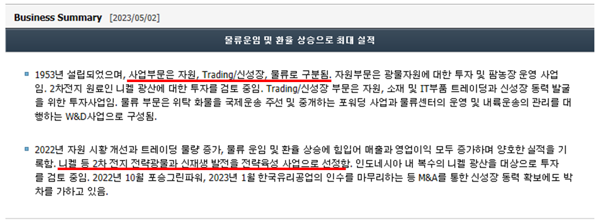 "LX인터내셔널"은 자원개발 , Trading, 그린.신성장사업 총 3가지의 사업을 진행한다고하네요. LX인터내셔널 공식 홈페이지 기반의 자료이고 Business Summary와는 같은 듯 상이합니다. 자원 개발 부문은 석탄과 니켈 광산을 개발하고 , 팜유농장 운영을 하는 사업이고, Trading 사업 부문은 자원 개발 부문에서 나온 부산물들을 Trading 하는 사업입니다. 그린.신성장 사업 부문은 국내 친환경 프로젝트에 참여, 자원순환 및 탄소저감 사업, 물류 부동산등의 사업을 진행하고 있습니다. 물류 부동산이라는 처음보는 단어가 등장하는데 알아보니 물류시설을 중개, 관리, 재임대 등을 이용하여 창고업무를 활성화시키는 비즈니스 모델이라고 합니다. 쉽게 말해 건물 임대와 같이 물류 시설을 임대하는 사업 이라고 보면 될 것 같습니다. 최근 친환경 트랜드와 맞물려 자원 개발 사업이 향후 성장성에 바탕이 될 것으로 보입니다. 2차 전지에 들어가는 광물은 여러가지가 있지만 그 중에서도 국내 양극 활물질(NCM, 3성분 계열/ 중국은 LFP )에서 가장 많이 사용되는 니켈 개발에 초점을 맞추고 있습니다. 전기차 시장이 확대 됨에 양극 활물질 수요도 증가 할 것이고 양극 활물질에 들어가는 니켈 광산 개발에 성공했다는 소식이 있으면 비약적으로 성장 할 가능성이 있는 사업입니다.