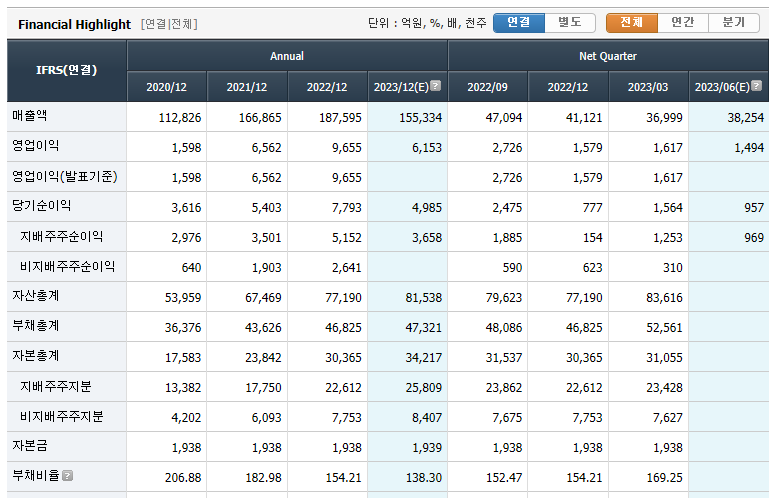 2020년 코로나로 인한 소비 둔화 생산 축소로 인해 매출이 많이 줄었으나 이후 유동성 공급으로 인한 개인 자산 증가로 인해 개인들의 소비가 폭발적으로 증가하고 이에 따라 나비효과 처럼 전반 적인 자원 가격이 오르면서 매출 성장에 기인 한 것으로 보입니다. 2022년은 러시아-우크라이나 전쟁으로 인해 환율이 상승하여 달러로 거래하는 업 특성상 환율 수혜로 영업이익이 비약적으로 증가했습니다. 이후 환율이 안정세로 접어들며 2023년은 2021년으로 회귀 할 것으로 전망하고있습니다. 안정적인 수익구조가 확보된 업들은 주가 상승이 제한적인 대신 배당금을 많이 지급하는것으로 알려져있습니다.