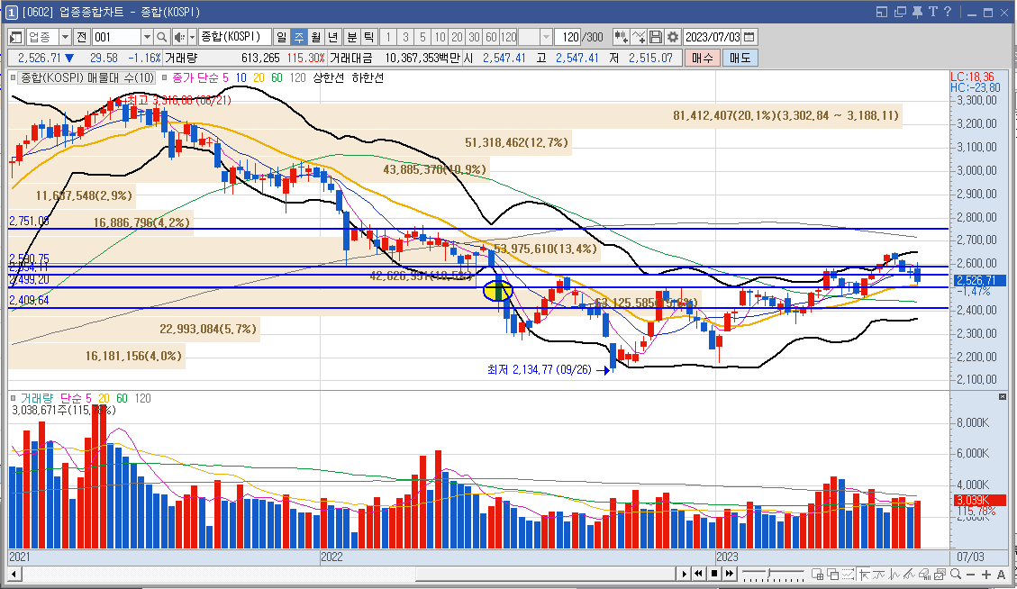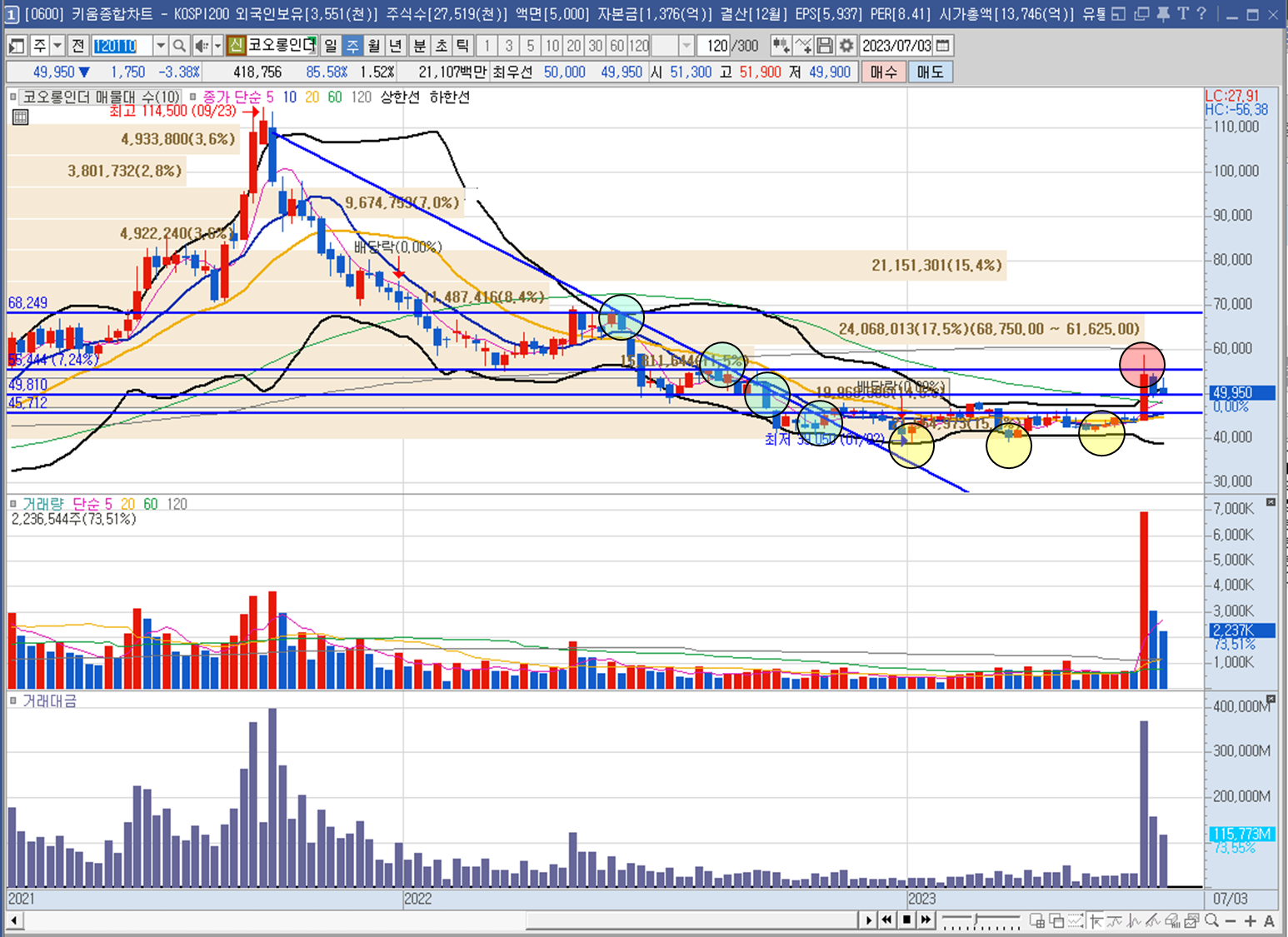 "코오롱인더"의 주봉차트입니다. 하락하던 추세에서의 매물대를 형성하고 (파란색 원) 있던 중 변곡점이 발생 했고 볼린저 밴드 하단, 이평선 하단을 지지(노란색 원)하며 수렴하다가 큰 거래대금이 터진 장대 양봉(빨간색 원)이 출회 하여 매물대를 (2번째 파란색 원) 도달하고 하락했으나 하단 매물대를(3번째 파란색 원) 지지하며 쉬어가고 있는 모습입니다. 주가 위치는 좋으나 이동 평균선 60선, 120선 기울기 하방, 7월 시장 상황 악화에 따라 주가가 횡보 또는 하락 할 수 있으니 하락 시 매수하는 방법을 취하도록 하겠습니다.😥