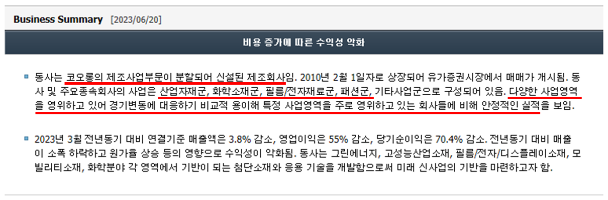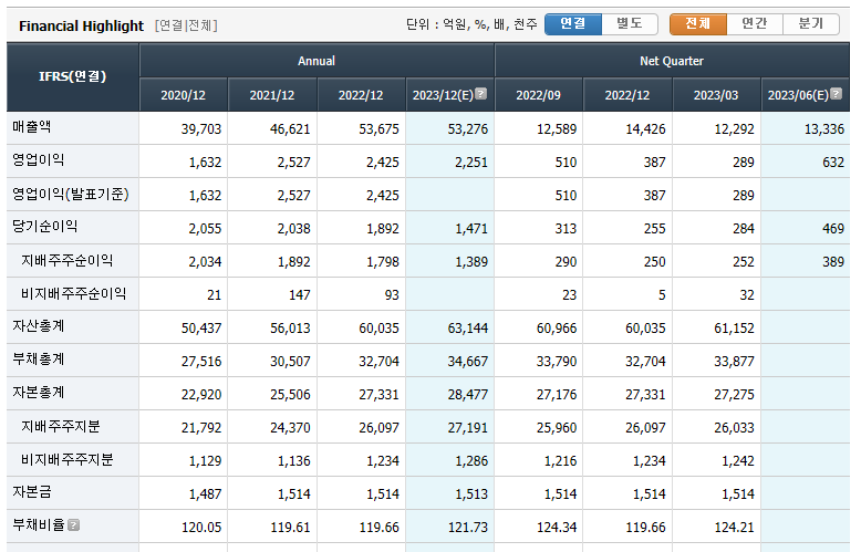 "코오롱인더"의 연결재무제표입니다. 2020년이후 매출액은 성장세에 있으나 영업이익은 동일하게 유지되고있습니다. 부채를 줄여 이자 비용 절감 및 완성차, 전기차 등의 성장 사업의 근간이 되는 소재사업을 더 성장시키고 고객사를 다양화해야 영업이익 개선이 될 것으로 보입니다.😥