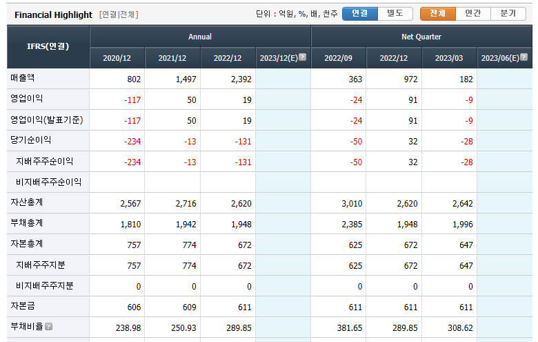 "유니슨"의 연결재무제표입니다. 2020년부터 매출액은 꾸준히 늘어나 2021년에 들어 영업이익 흑자 전환하였으나 당기순이익은 마이너스 수준입니다. 번돈보다 나갈 비용이 많으니 재무구조가 상당히 좋지 않은 상황입니다. 이는 자산 중 부채가 차지하는 비율이 300%수준까지 높아져있고 고금리 상황에 금융 비용이 많이 발생하여 당기 순이익이 계속해서 적자인 상황으로 보입니다. 재무 제표 만 봤을 때는 재무 구조 개선을 위해서는 추가 증자를 통해 현금을 확보하여 부채부터 줄여나가야하지 않나 싶은 상황입니다.😥