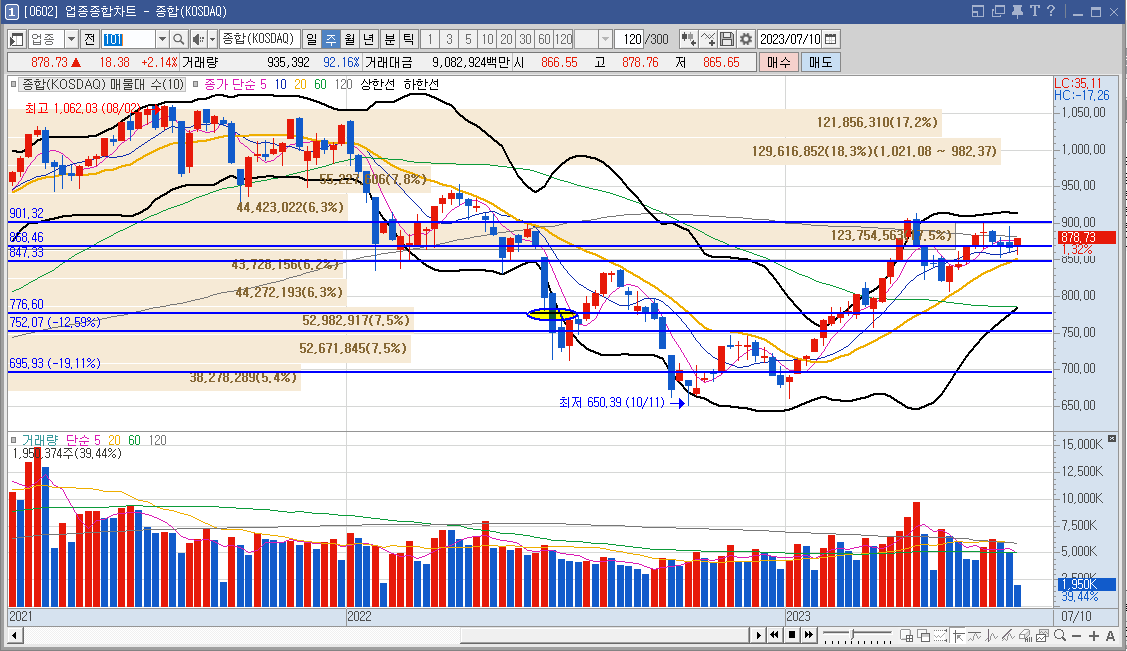 코스닥 시장의 업종 종합차트입니다. 금일 지수는 18.38 포인트 상승한 878.73포인트로 마감했습니다. 월요일 850포인트 및 20선 부근 지지를 받아 반등을 준 모습입니다. 금일 강한 상승으로 인해 120선이 상방으로 추세전환을 하였고 이대로 주봉을 마감한다면 하락이 예상 만큼 길지 않을 수 있습니다. 상승도 필요 없고 지수가 보합권이 계속 유지됐으면하는 바람입니다.금주 마감까지 지켜보도록 합시다.😣