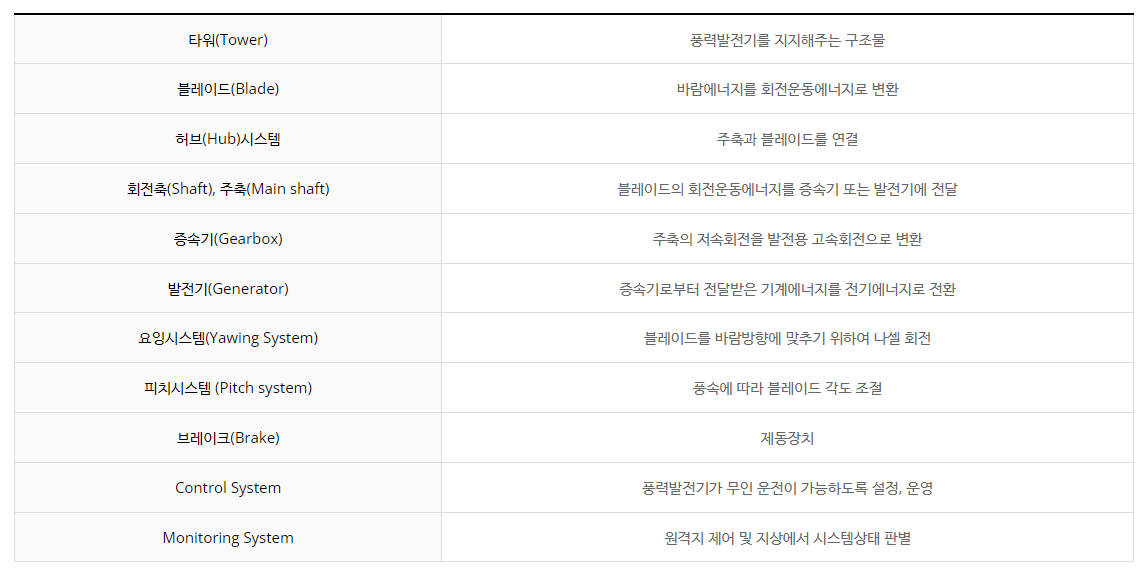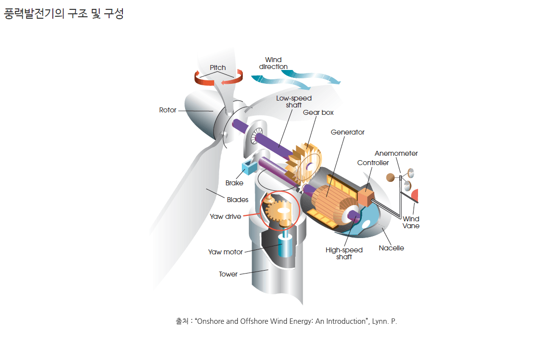 "유니슨" 이라는 회사는 풍력 발전 사업에 포커싱을 맞추어 풍력 발전 시스템, 풍력 발전 타워 등 풍력 발전기 완제품을 생산하고 판매하는 사업을 영위하는 회사입니다. 풍력 발전 시스템을 간단히 설명하기 위해 아래 그림을 가져와봤습니다.