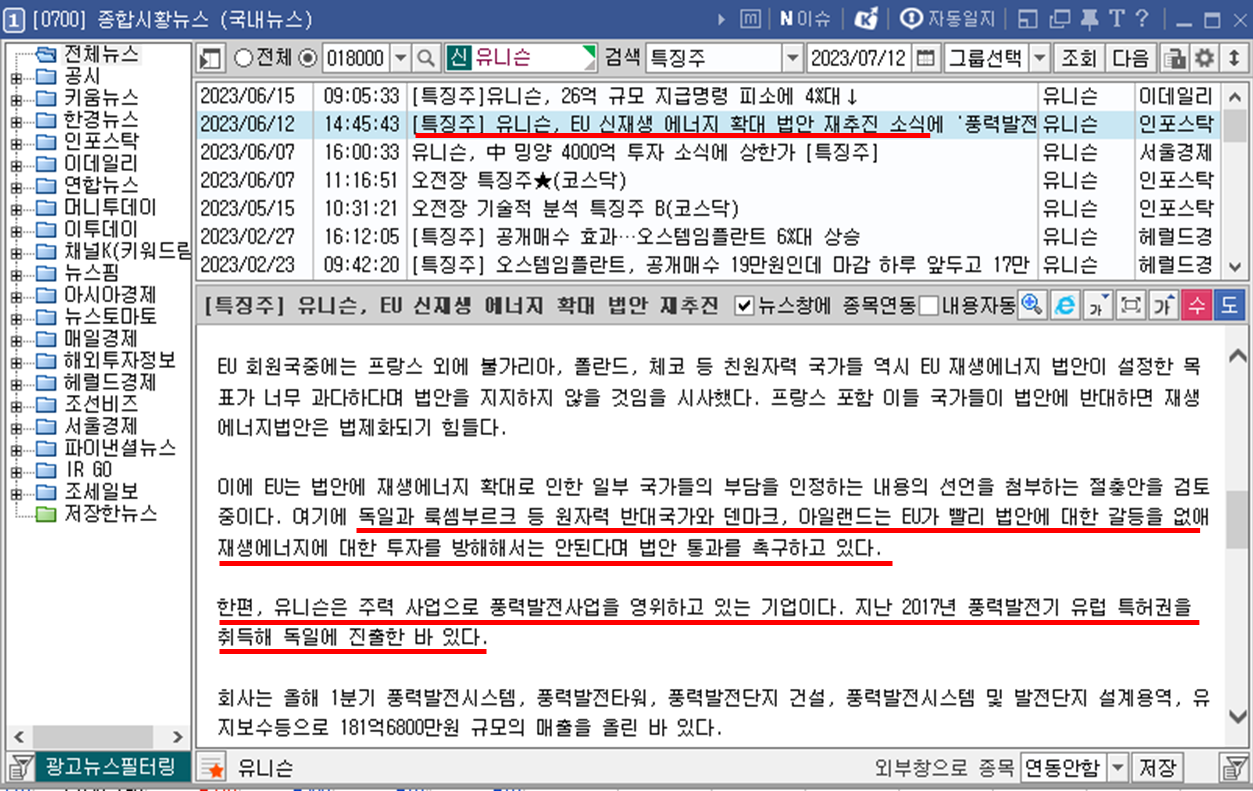 "유니슨"의 종합 시황 뉴스입니다. 첫번째로는 EU에서 설정한 재생 에너지 확대 목표치가 과하다는 의견이 국가별로 분분하여 법안이 통과되지 못하고 있는 상황이기에 절충안을 마련하여 국가들을 달래고 있는 상황으로 보입니다. 절충안을 마련하게 되면 법안이 통과되고 목표치 달성을위한 신재생 에너지 투자가 지속되기 때문에 기존 유럽에서 특허권을 획득한 유니슨이 수혜를 받을 것으로 보는 뉴스가 있습니다.