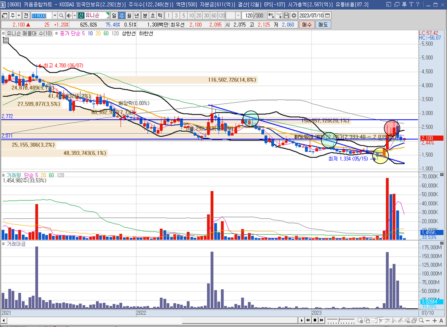 "유니슨"의 주봉 차트입니다. 하락하던 추세에서 추세 전환을 하기위해 두차례 정도 시도가 있었으나 실패하여 매물대를 형성하였고 세차례 시도 끝에 추세를 돌파한 모습입니다. 어떤 원인인지 확인은 해야겠으나 거래대금이 수반된 장대 양봉이 출현하여 다음 매물대의 물량들을 소화하고 이전 매물대 부근에서 잠시 쉬어가고 있는 상태입니다. 매물대와 60선이 같이 있는 부근이기 때문에 지지가 나왔으나 추세 전환 후 여러개의 바닥을 형성하지 않고 급하게 오른 상황이기 때문에 안정적이지 않아 매수하더라도 장기적으로 들고가기 보다는 단기적으로 접근해야 하는 상황으로 보입니다.🤔