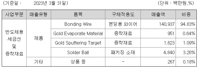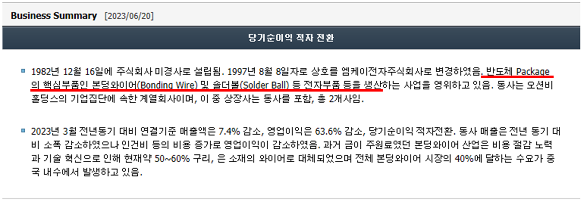 "엠케이전자" 는 반도체 패키징에 사용되는 본딩와이어와 솔더볼을 판매를 주력으로 하는 회사입니다. 여기서 본딩와이어란 리드와 실리콘칩을 연결하여 전기적 신호를 전달하는 부품이고, 솔더볼이란 반도체 칩, 회로 모듈, PCB 기판을 접착하여 전기적 신호를 전달하는 미세한 공모양의 전자부품입니다. 고등학교 때 기술과 가정(?) 시간에 배운 납땜하는거라고 보시면 될 것 같습니다. 그 외 박막 증착 재료 사업, 2차 전지 사업을 하고 있다고 전자 공시 시스템(DART)에는 나와있으나 아직 시작 단계인 것 같습니다. 올해 1분기 매출액을 보시면 나머지 사업은 거의 매출액에 미세한 영향을 끼치고 본딩와이어가 94.83%로 거의 대부분에 비중을 차지하고 있습니다. 반도체 업황이 저점을 찍고 AI 인기와 더불어 반등 할 것이라고 예상하는 추세이며 이를 반영하듯 반도체 소,부,장 주의 대부분이 매출액이 나오지 않는데도 불구하고 상승하고 있으니 지켜봐야겠습니다. 🙂
