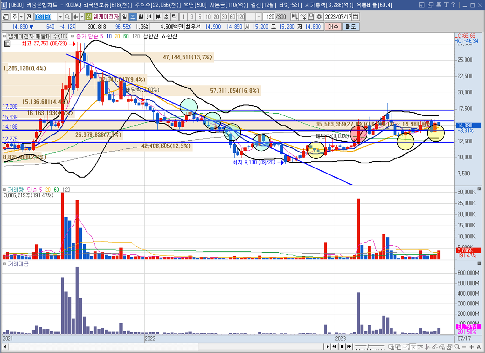 "엠케이전자"의 시가총액은 대략 3300억, 거래 대금 45억으로 형성되어있어 상대적으로 가볍기 때문에 거래대금만 붙어주면 급등 가능성이 있고 유동 비율 60.36%의 적정 수준으로 대주주에 의한 주가변동폭이 그리 심 할 것 같지는 않습니다.최근에 들어온 거래대금이 얼마나 있는지 아래 기술적 분석을 통해 자세히 알아보도록 하겠습니다.