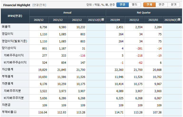 "엠케이전자"의 연결재무제표입니다. 2021년 매출액과 영업이익 그리고 당기순이익이 피크를 찍고 2022년부터는 인건비 상승으로 인해 영업이익이 줄었고 당기순이익이 두자리 숫자로 내려온 상황입니다. 2022년 러시아 우크라이나 전쟁으로 인해 시장이 망가져 파생 상품 평가 손실, 인플레이션으로 인한 금리 인상으로 이자 비용등으로 당기순이익이 급감한 것으로 보입니다. 현재 기술력을 바탕으로 금을 주재료로 쓰는 본딩와이어의 성분을 은, 구리로 대체하며 원재료 가격을 줄이는 활동을 진행하고 있어 영업이익이 개선 중에 있다고하니 지켜봐야겠습니다. 개인적으로드는 생각은 원재료를 아얘 교체 해버리는건 그 만큼 판매 단가도 줄어드는 것이 아닌가 생각하는데 판매 단가가 줄어든 폭보다 원재료 비용 축소폭이 더 큰가 보네요.🤔