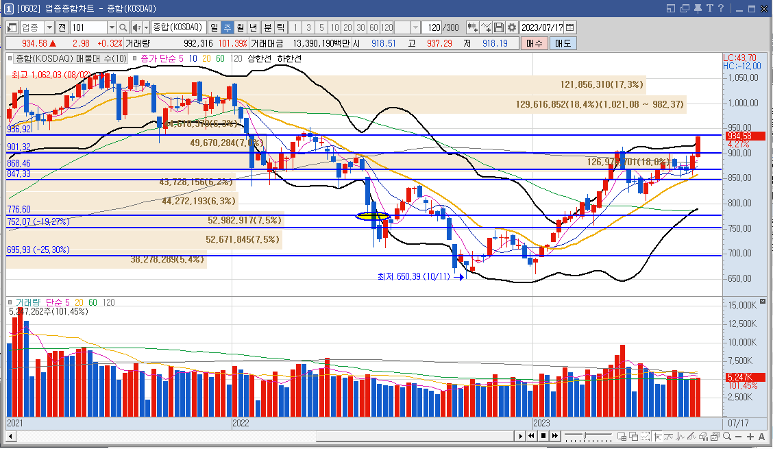 코스닥 업종 종합 차트입니다. 전 거래일 대비 2.98 포인트 상승한 934.58 포인트로 마감했습니다. 코스닥 지수는 최근 고가를 돌파하여 주봉을 마감했습니다. 코스닥 지수는 다음 매물인 935 포인트 근처까지 왔고 이평선과 이격이 벌어져 다음주는 쉬어가는 흐름이 나오지 않을까 생각합니다. 코스닥 지수는 시가총액 1,2 위를 차지하는 에코프로비엠과 에코프로에 독주로 인한 상승으로 그 외 종목은 코스닥 상승분 대비 수익이 상대적으로 저조 할 수있습니다. 공매도 숏커버리징 원인것을 보이고 이러한 급등 다음은 급락 또한 올 수 있으니 보유 종목이 수익이 안난다고해서 급등주에 올라타는 것은 피하시기 바랍니다. 😅