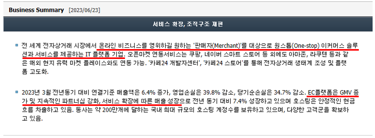 "카페24"라는 회사는 온라인 사업을 하고싶은 사람들에게 특정한 가치를 제공하여 수익을 창출하는 기업입니다. 예를 들면 흔히들 이용하는 네이버 쇼핑과 비슷한 형태의 사업이라고 보시면 될 것 같습니다. 네이버 쇼핑도 판매자가 네이버 쇼핑 내에 특정 가게를 만들고 이 가게에서 물건을 팔게되면 일정 수수료를 네이버에 납부하는 형태로 네이버가 수익을 창출 할 수 있는 것과 마찬가지입니다. 카페 24는 쇼핑몰 구축 외 해외 마케팅 (페이스북 연동), 물류, 언어번역 등 온라인 비지니스를 하고싶은 사람들에게 여러 가치를 제공합니다. 카페24는 또한 이커머스 플랫폼에 GMV(Gross Merchandise Volume) 증가, 파트너십 강화, 서비스 확장으로 인해 매출 성장을 기록하고 있는 것으로 보입니다. 온라인 판매로만 이루어지는 산업군에 증가, 이용자들이 많은 SNS들과 연동하여 고객들을 늘리면 성장 가능성이 있어보이나 기대 할 만한 아이디어는 떠오르지 않네요. 🤔