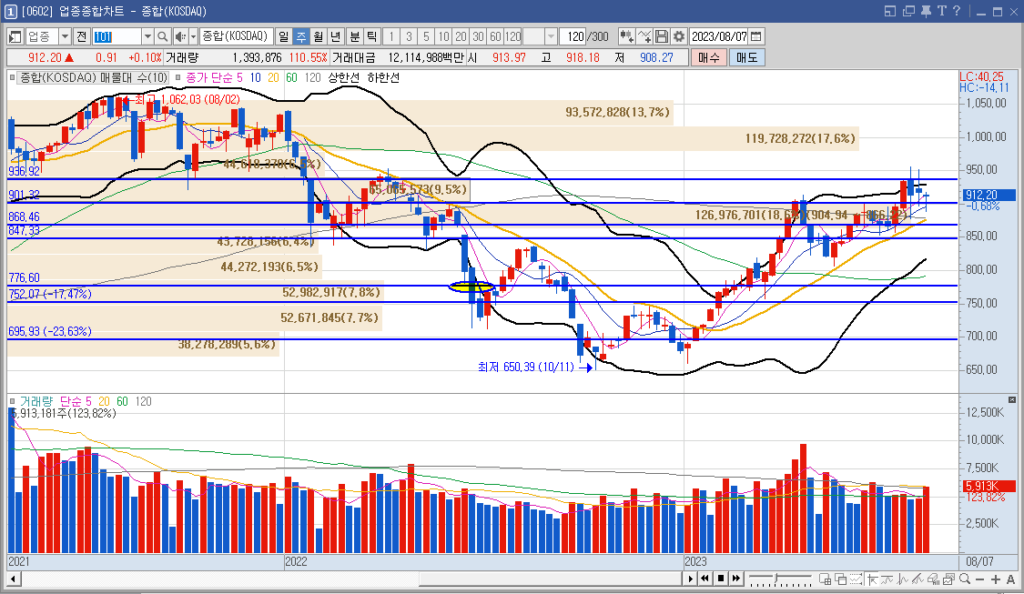 코스닥 종목의 업종 종합 차트입니다. 금요일 종가 기준 0.91포인트 상승한 912.20포인트로 마감했습니다. 에코프로 관련주의 상승 및 하락세로 코스닥 시장 전체에 충격을 준 상태이나 다행히 에코프로 관련주에 수급이 쏠려 하락하던 종목들에 다시 수급이 고루 분산되는 흐름을 보여주고 있어 900포인트의 지지 라인 위로 밑꼬리를 달고 상승마감하였습니다. 어찌 되었든 20선,60선 이평선 이격으로 인해 8월 마지막까지는 안심 할 상황은 아닙니다. 목표 수익을 정해두고 목표 수익에 도달 하면 분할로 매도 하는 것을 추천드립니다. 지금은 수급이 제약바이오 주로 몰리는 느낌이 있어 제약 바이오주도 같이 지켜보는 것도 좋을 것 같네요.