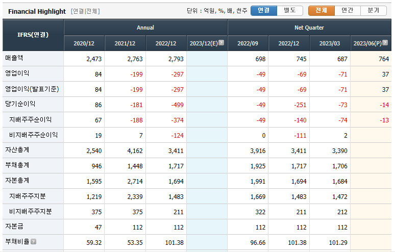 "카페24"의 연결재무제표입니다. 2020년부터 2022년까지 매출은 지속 증가하는 추세인데 영업이익은 마이너스를 기록하고 있습니다. 영업 비용 증가는 신규인원 채용으로 인한 판관비 증가가 원인으로 보입니다. 온라인 사업에 걸맞게 자동화, 시스템화등을 통한 대대적인 구조조정이 필요해보입니다. 2023년 6월 추정치는 당기순이익은 흑자전환, 당기순이익은 적자폭을 축소하고 있네요. 이는 온라인 비지니스를 통해 수익을 창출하는 사람들이 점차 증가하는 추세로 보입니다. 관ㄹ녀되어 어떤 산업군이 따라 움직일지도 추후 확인해봐야겠습니다.