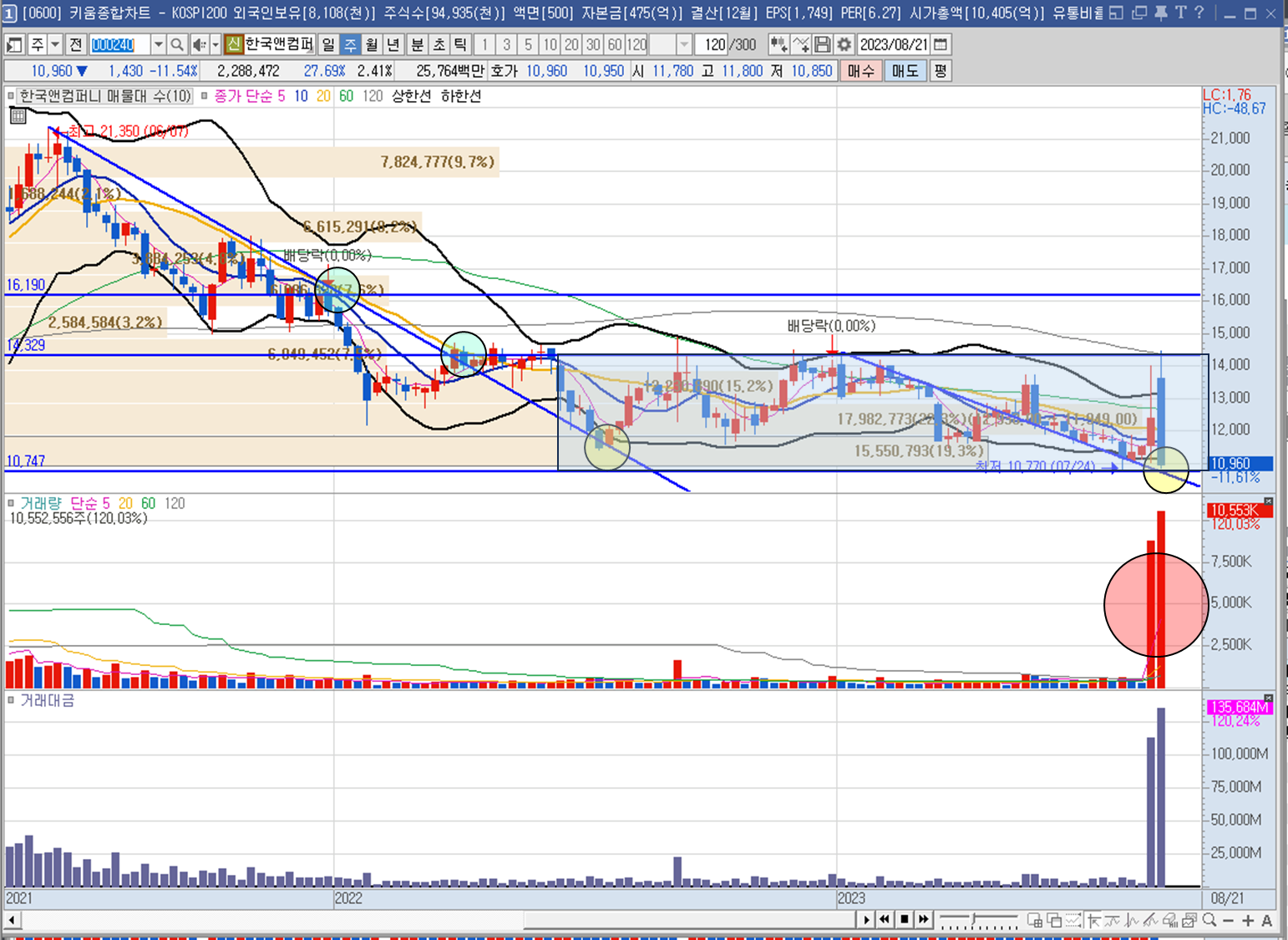 "한국앤컴퍼니"의 주봉 차트입니다. 끝을 모르게 하락하던 주식이 기술적 약 반등으로 인해 추세를 돌파하였으나 (두번째 하늘색 원, 거래없이 돌파한 것은 개인적으로는 자연 돌파(?) 라고 부릅니다.) 이후 재차 하락하여 하락 추세선 반등으로 상승 (첫번째 노란색 원) 하고 큰 박스권을 그리면서 유지 중입니다. 금일 종가 기준으로는 하락 추세선의 지지 자리 까지 와서 기술적 반등으로 노려 볼 만한 자리입니다. 🤔 최근 거래 없이 지속하여 빠지는 중에 지난주와 이번주에 엄청난 거래량이 출회하여 어떤 이슈가 있었는지 아래 종합시황 뉴스에서 확인해보도록 하겠습니다.